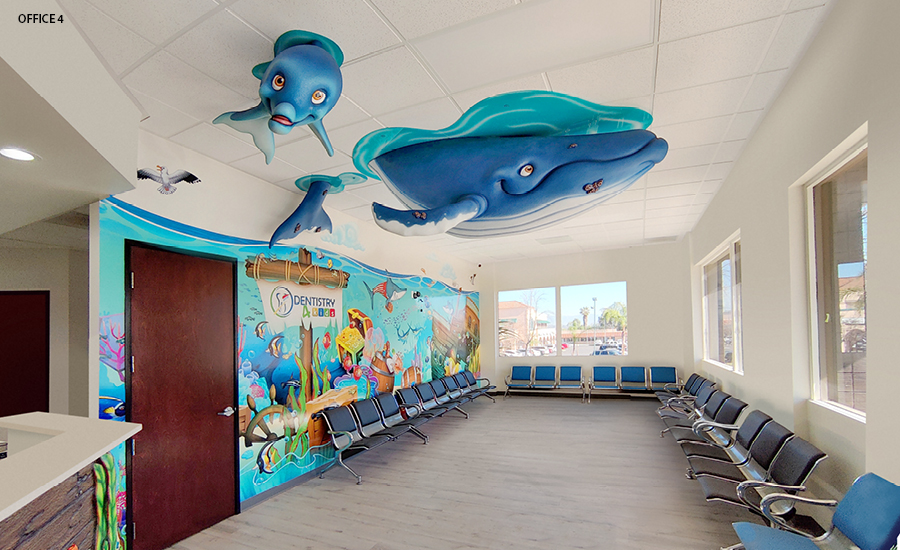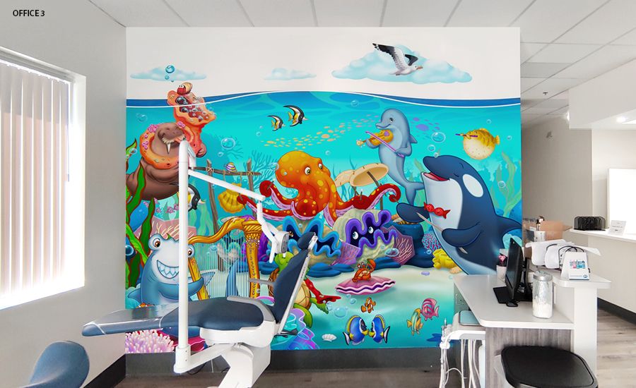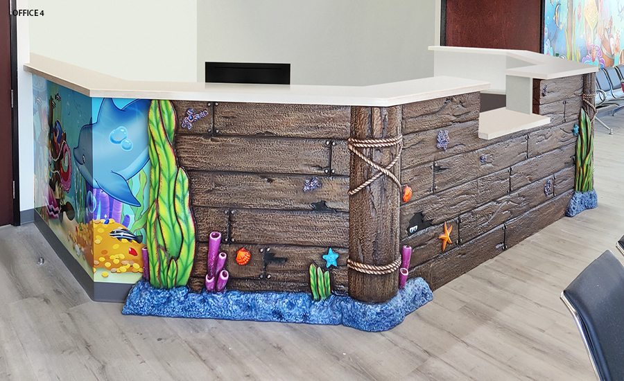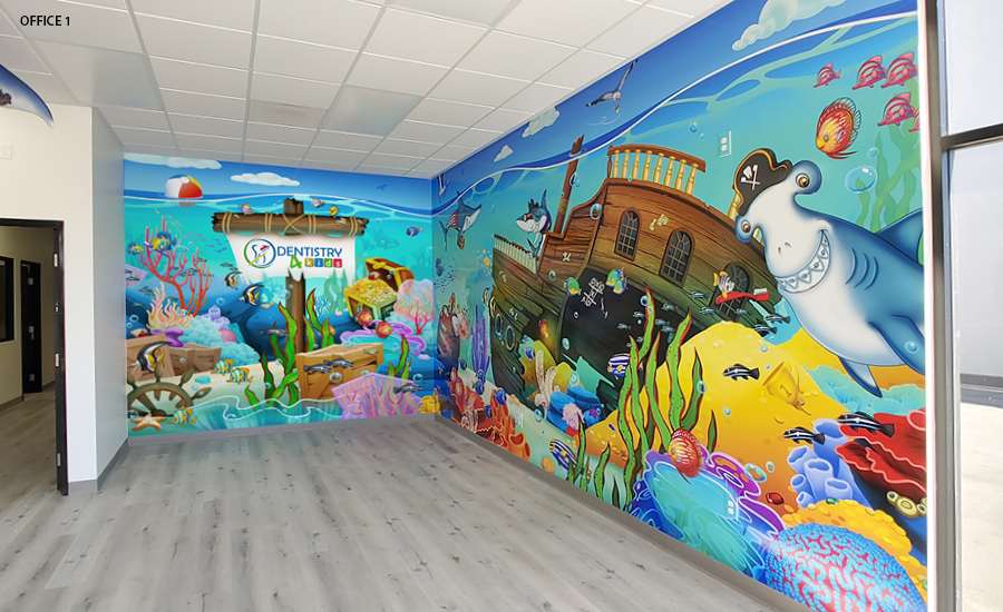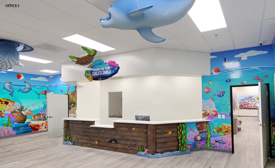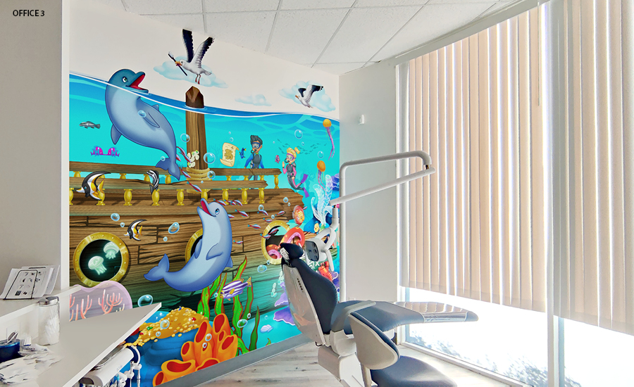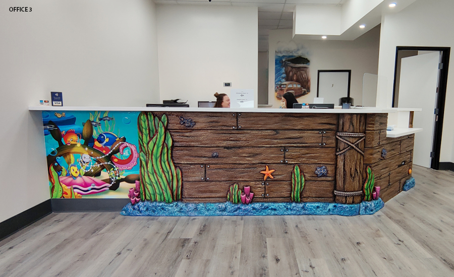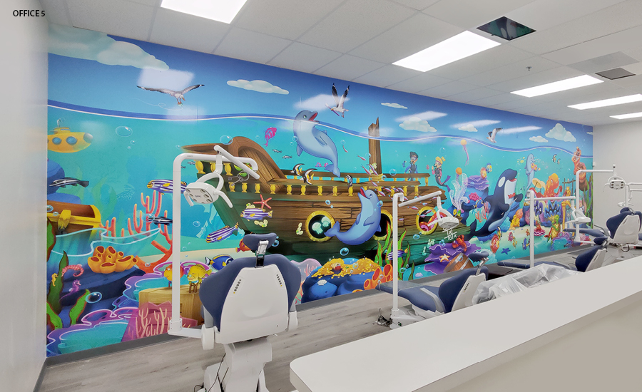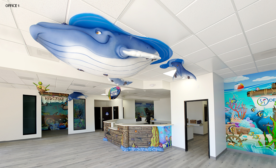 Patients of this dental group can walk into any of these offices and expect to be greeted by a cladded pirate ship themed reception desk and bright welcome sign. Next, they can then say hello to a friendly big blue whale, grin back at the smiley dolphin, and give a wave to a flip-flopping sea turtle.