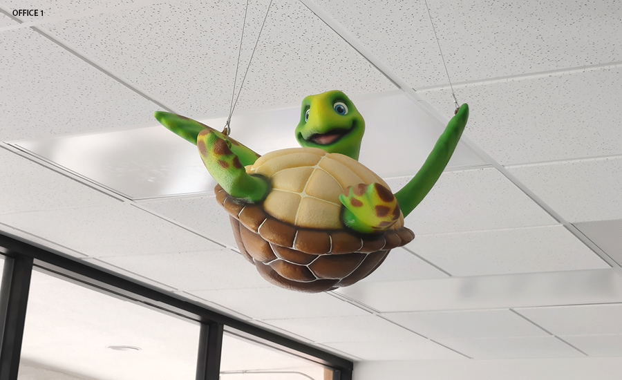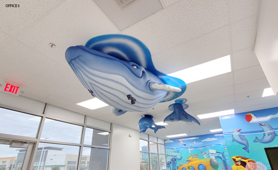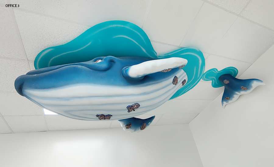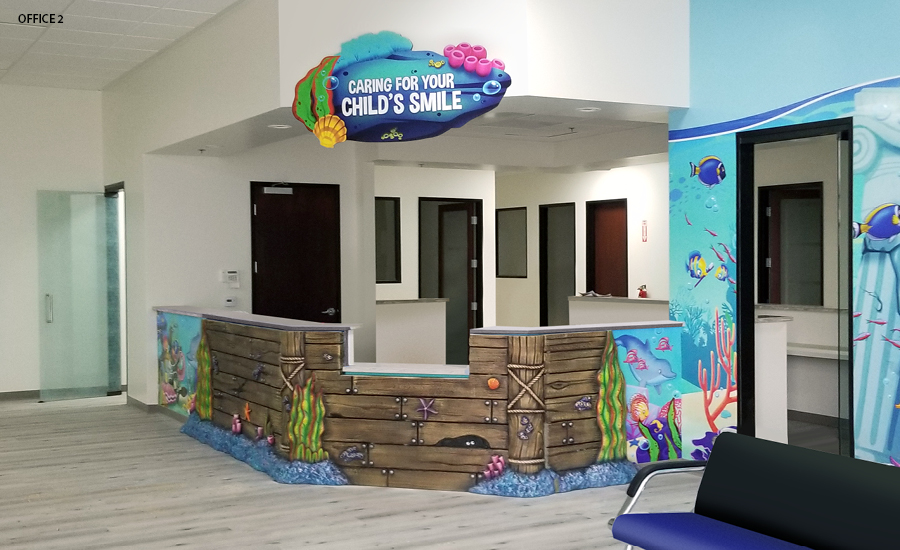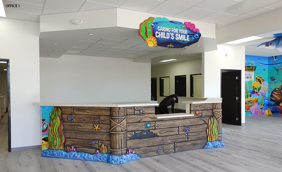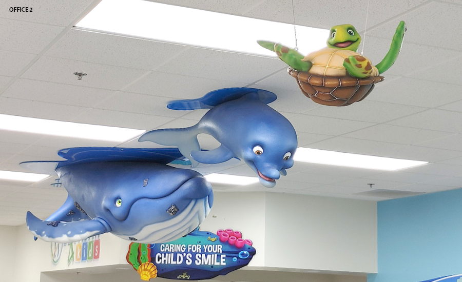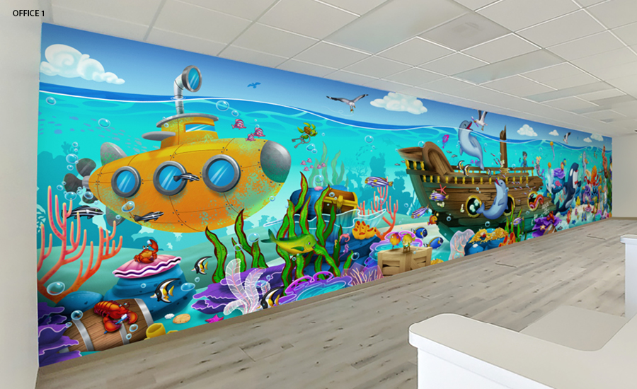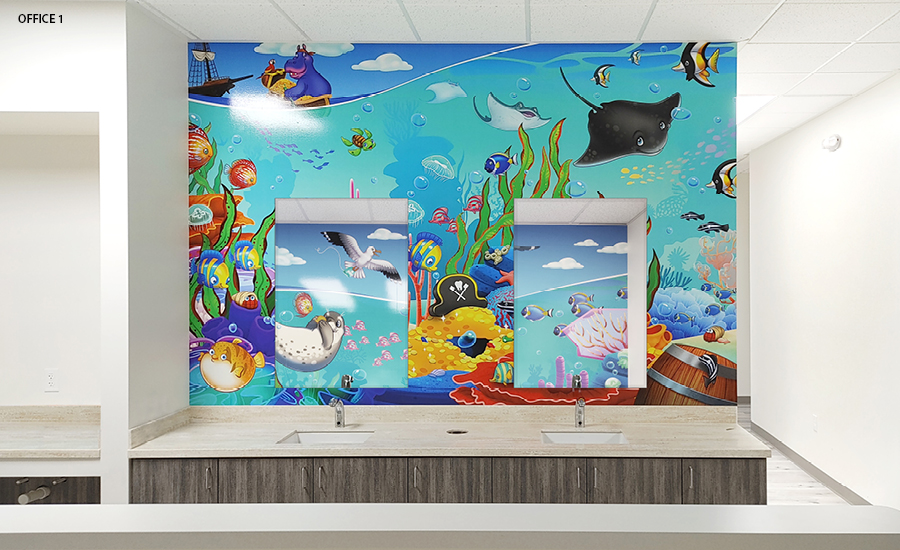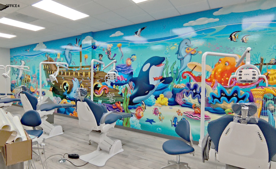 Patients of this dental group can walk into any of these offices and expect to be greeted by a cladded pirate ship themed reception desk and bright welcome sign. Next, they can then say hello to a friendly big blue whale, grin back at the smiley dolphin, and give a wave to a flip-flopping sea turtle.