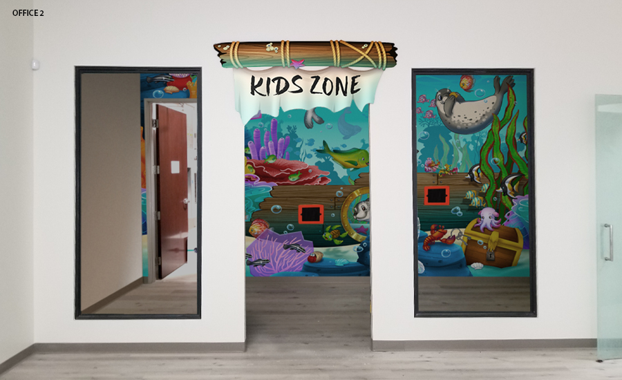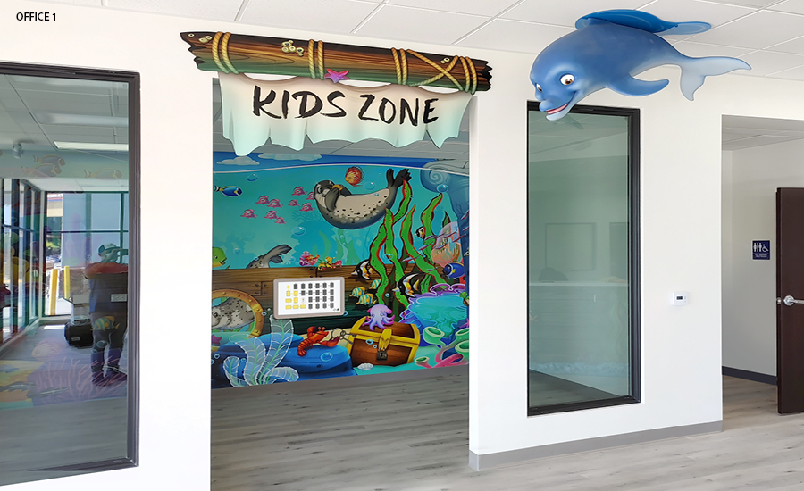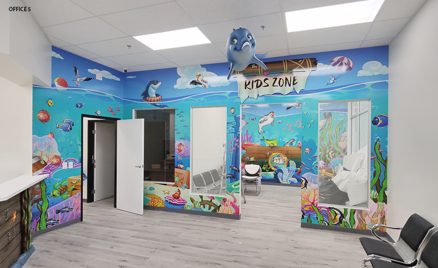 Whichever location they decide to visit, parents will be at ease knowing that their children can be entertained in a dedicated kids zone equipped with wall-mounted gaming systems and colorful underwater themed murals while waiting for their appointment. The wall mural, Kids Zone sign, and gaming was adapted to fit the wall space in each location.