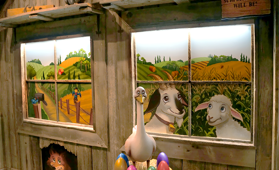 IDS added some great features to the room: the pickup truck seating bench is the perfect place for visitors to sit and take in all the fun and excitement this unique setting has to offer. The goose nest features 6 colorful eggs, one of which holds a hidden key. This key opens a barn door to the magical toy room, and opening it is a special way to get kids involved in the experience.