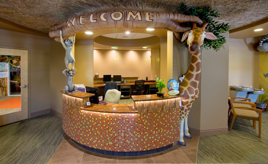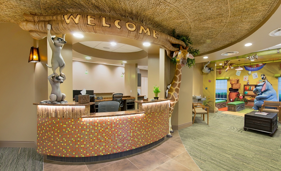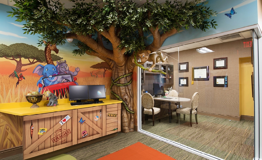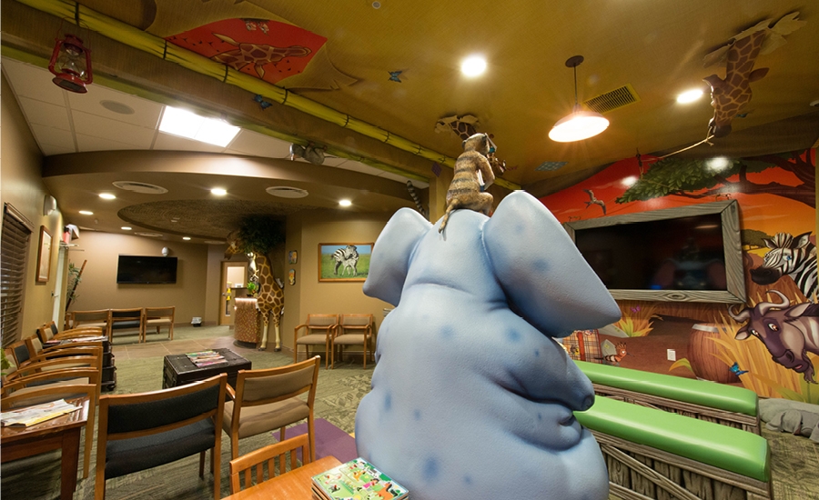 The theater play area is the main feature in this office. The separate area creates a space made just for kids. Their anxieties will disappear while watching movies with their big elephant companion, who doubles as a great photo op for parents to capture their kids.