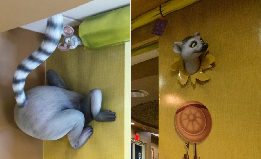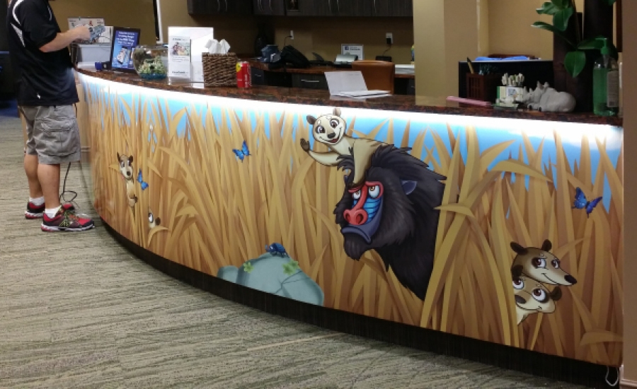 The two cute meerkats and perturbed giraffe surrounding the tiled reception desk creates a great example of a reception desk that has a touch of IDS 3D theming, along with some great interior design. You can have cute and high end in the same office. IDS concept illustrators will work with your architects and interior designers to ensure that each piece we create is built to suit your office decor.