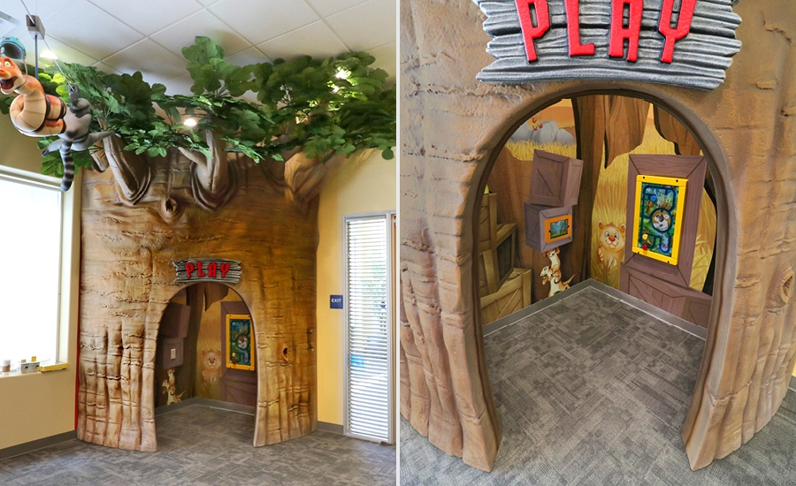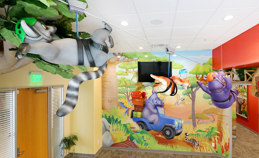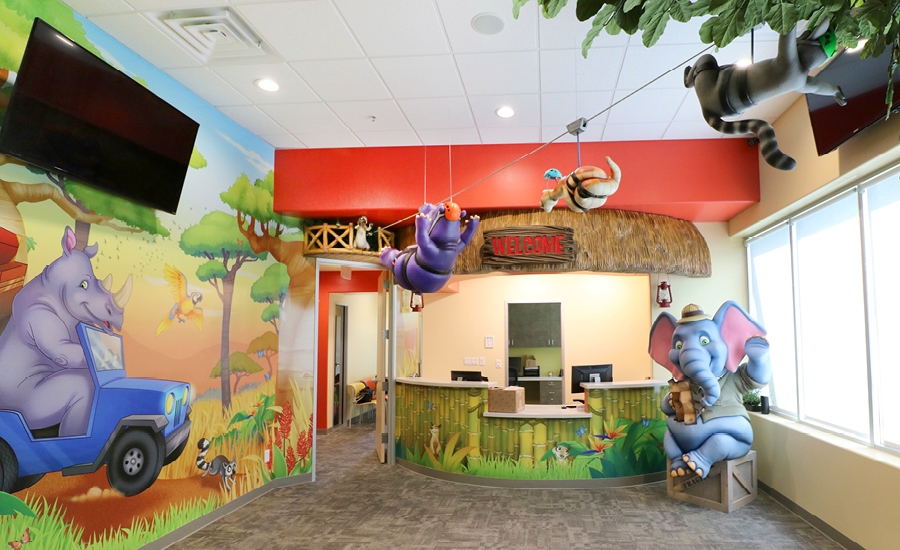 Throughout the office, faux windows and friendly animal details make the environment feel lively and immersive, while custom wall murals give each treatment room its own jungle personality.
