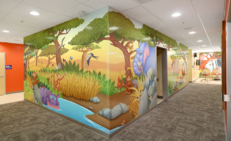 Even the hallways become part of the story, with cheerful murals helping soften the clinical setting and create a space that feels comforting, memorable, and full of adventure.