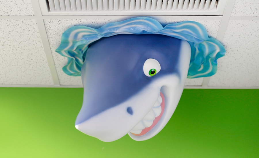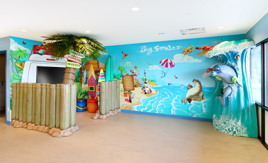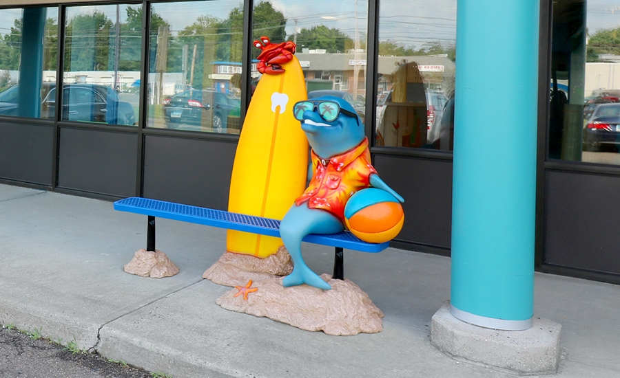 You’ll always find the perfect weather at this beach-inspired dental office! Patients are greeted by a friendly dolphin who is posing for photos with kids.