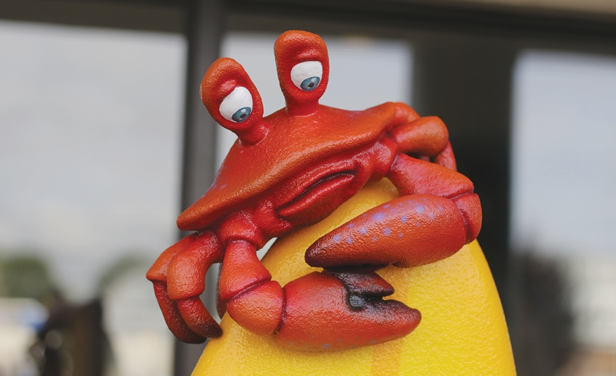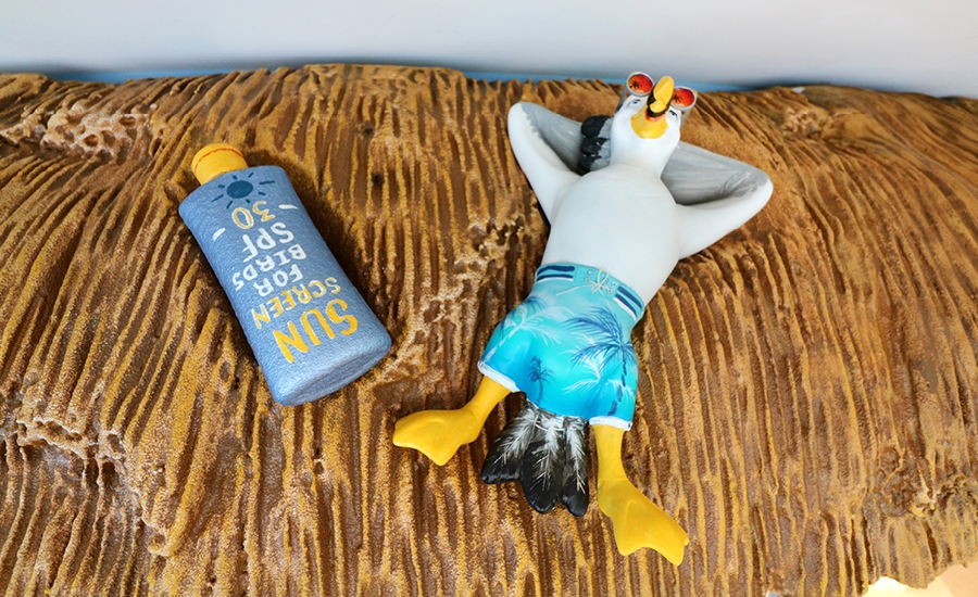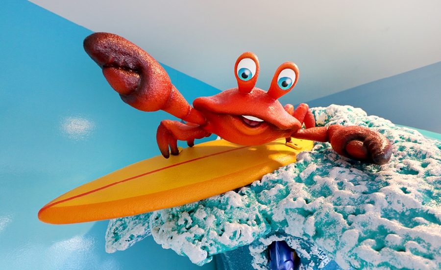 Meanwhile, the check-in desk inside the office has been taken over by a pair of silly seagulls. Notice one of them has a camera? Using a nearby tablet, children can take a fantastic photo as they surf beside a fun crab and dolphin.