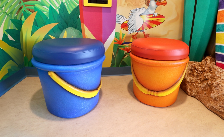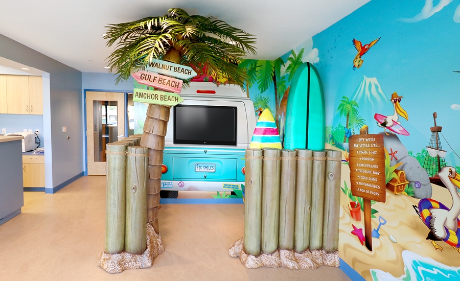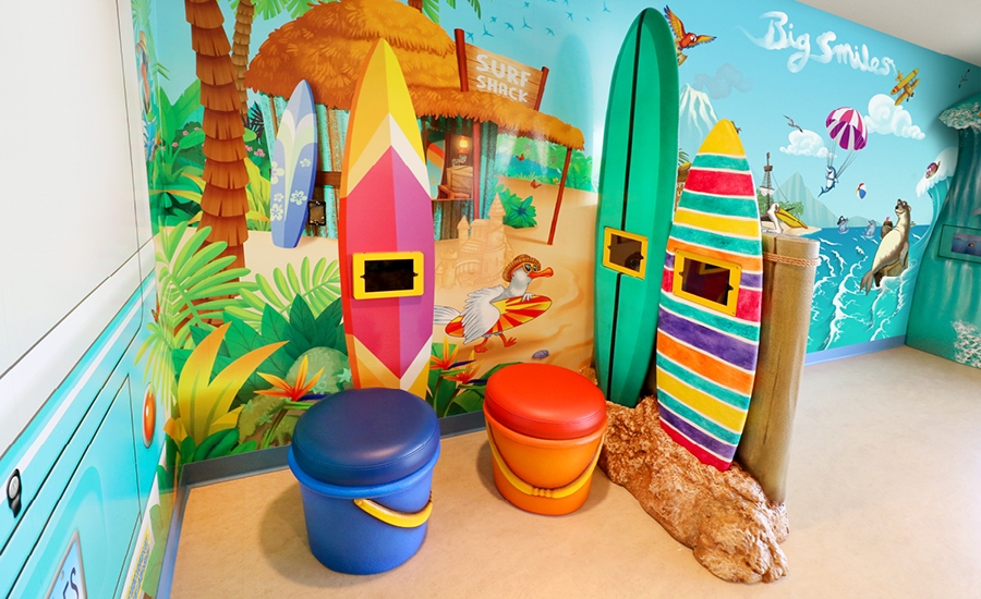 After checking in, patients have the opportunity to visit the open play area. Interactive game tablets are built into the custom surfboards, which also include bright sand-pail seating. The game tablets have been designed with education in mind so it is easy for patients to learn about dental care while having some fun!