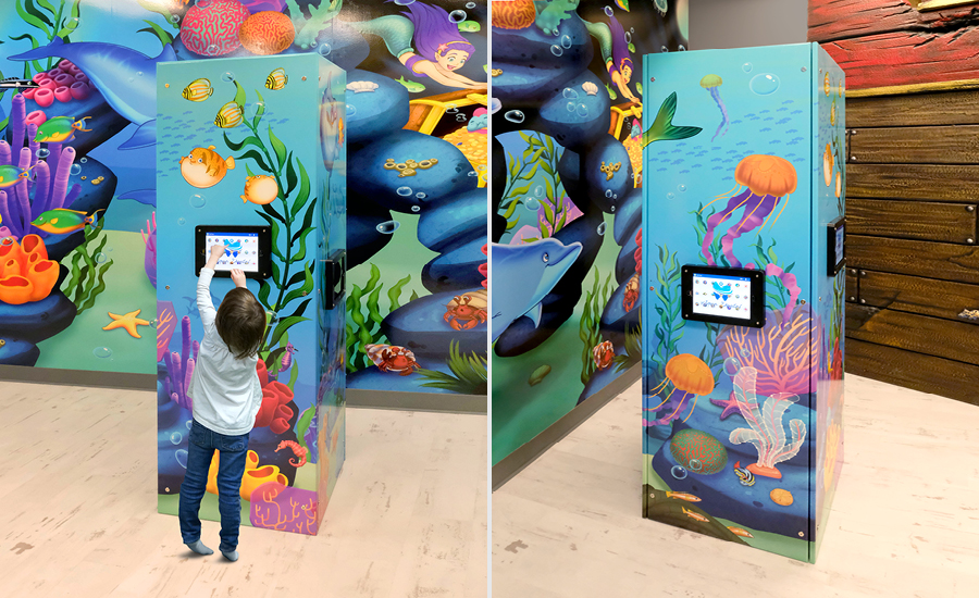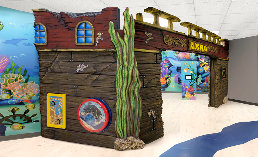 Located on a hospital campus, the centerpiece of this mixed specialty practice is the magnificent sunken ship games area. Made to look like a waterlogged hull, the exterior of the playroom features a towering kelp column, cast barnacles, and decayed wood detailing. Game tablets and interactives are also mounted on the sides and wall adjacent to the ship. Inside the wreckage, kids will have plenty to explore from the vivid undersea wall murals, to the yellow submarine slide complete with a porthole window and a sandy ocean floor base. A custom game tower with pre-installed tablets and murals add even more waves of fun.