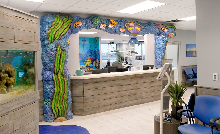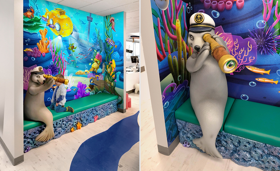 Patients will take a thrilling trip down to the bottom of the sea in this underwater themed project! The father-son dentist duo of this office were very excited to expand their existing fish tank decor out into a full theme.