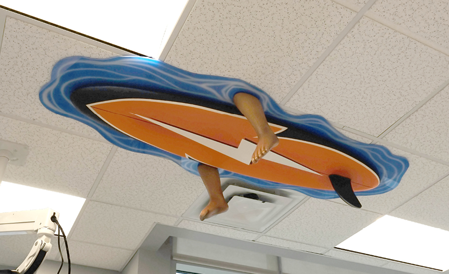 In the treatment bays, patients will find themselves entertained by an array of humorous ceiling-mounted sculptures. Different characters swim throughout both the pediatric and ortho open bays to complete the theme.