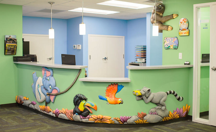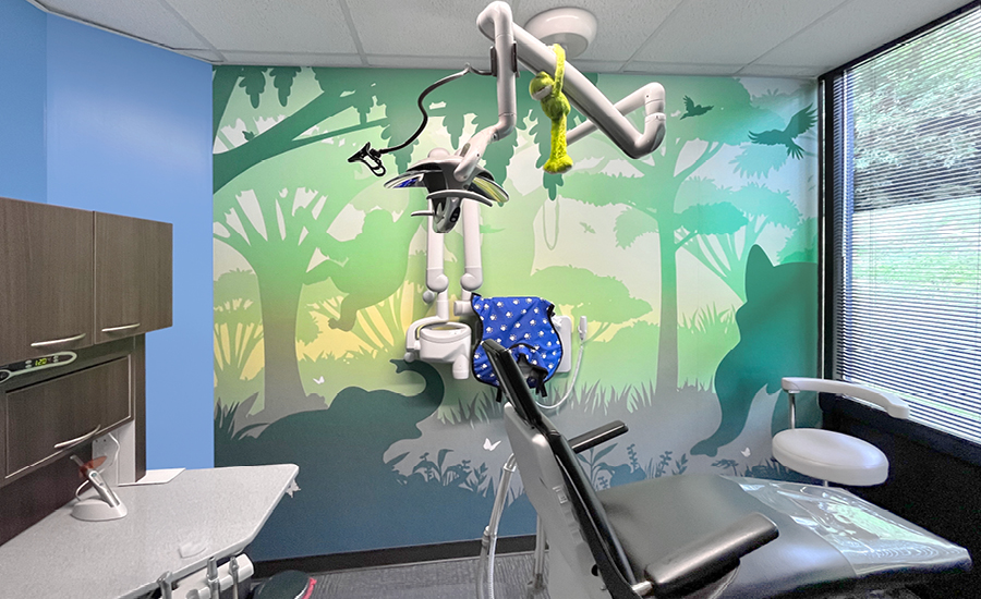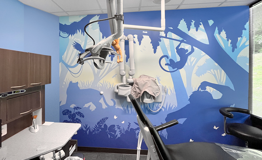 Each treatment room continues the jungle theme with beautifully designed silhouette murals of rainforest animals and playful monkeys swinging through the trees. The calming color palette and nature-inspired artwork help create a relaxed environment, making dental visits a positive experience for young patients.