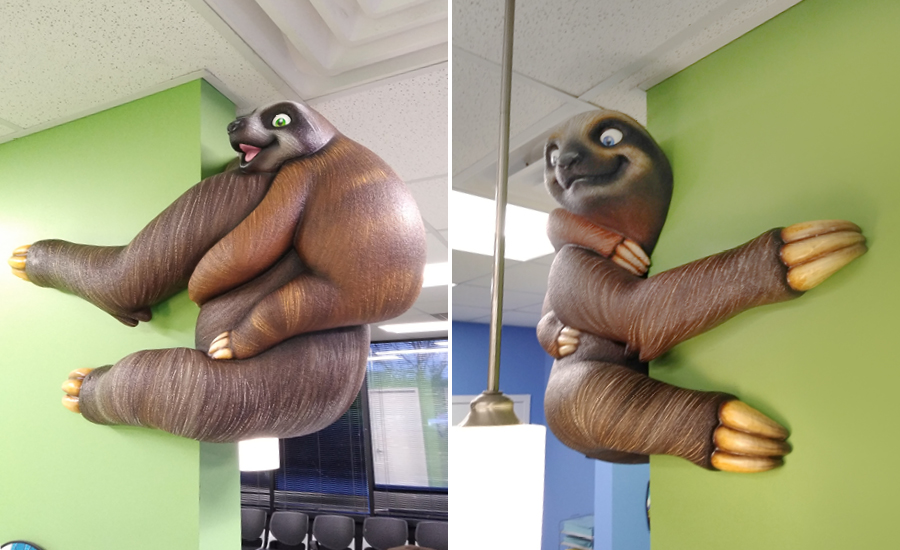 The reception area sets the stage for the adventure, with a colorful rainforest backdrop featuring an adorable pair of sloths.. The front desk is adorned with 3D jungle animals, making check-in feel like the start of a safari.