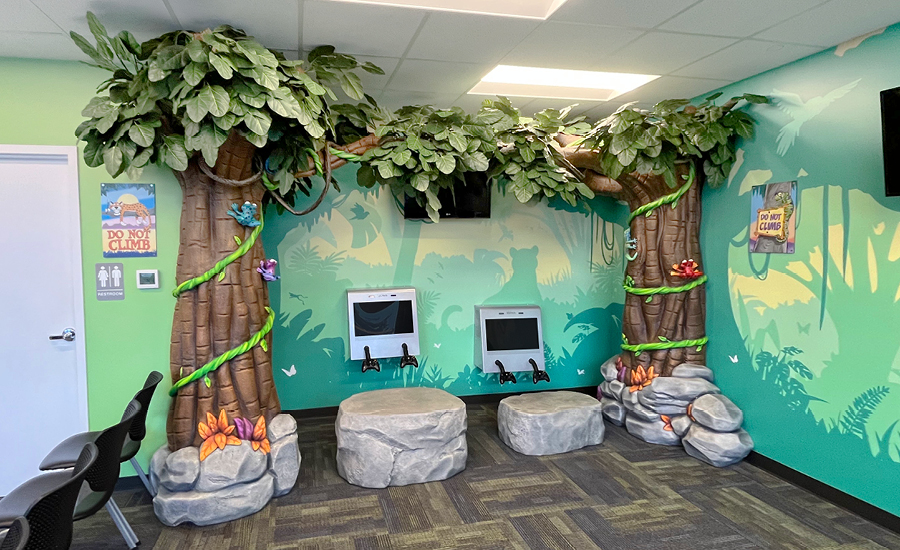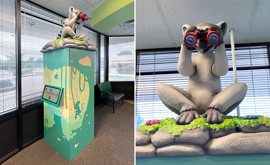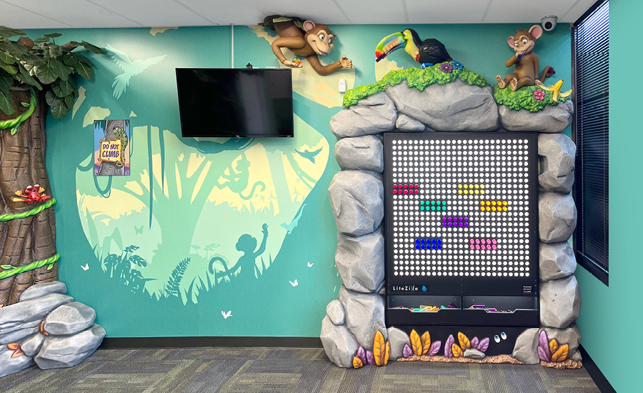 The waiting area is a true jungle escape, complete with towering trees, rock seating, and interactive games. A custom-built Litezilla wall is framed by a rocky jungle arch, while lemurs and toucans perch above, watching over the fun. A separate game tower, featuring a lemur with binoculars, keeps kids entertained as they wait.
