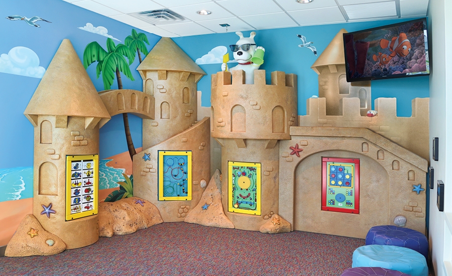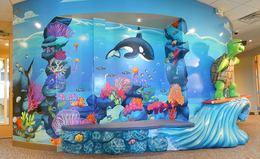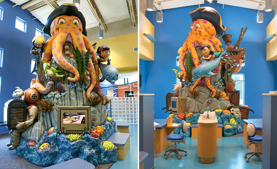 The centerpiece in this office is an amazing rocky tower in the open bay treatment room. It features the three office mascots playing amongst a sunken ship that’s spilling its cargo of cannons and treasure. Also found on the tower is a deep sea diving suit, a big octopus pirate, and over 100 fish, and other deep sea critters. This tower isn’t just decorative – sculpted into the tower are four video game units and bench seating.