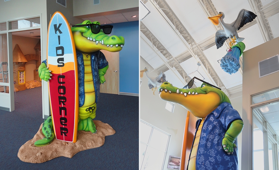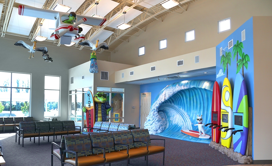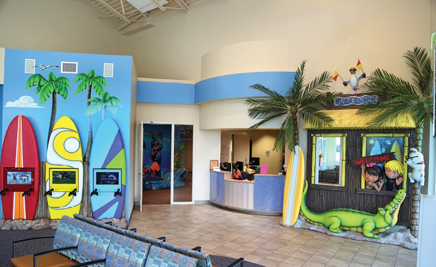 There is a large reception area with a private play zone for kids. Photo ops are abound in this office. Bring your camera and catch some waves with the surfing dog or chill out with the alligator who’s about to get a bucket of water poured on his head by a cheeky pelican.