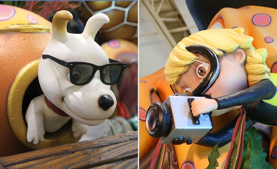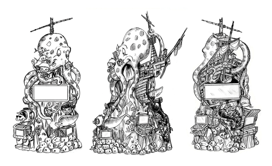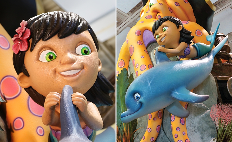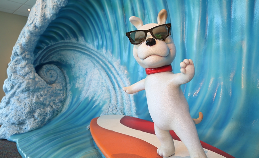 Welcome to the South Pacific! This client had 3 mascots that were incorporated through the office – a stylish dog, and mergirl and her surfing friend.