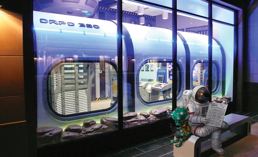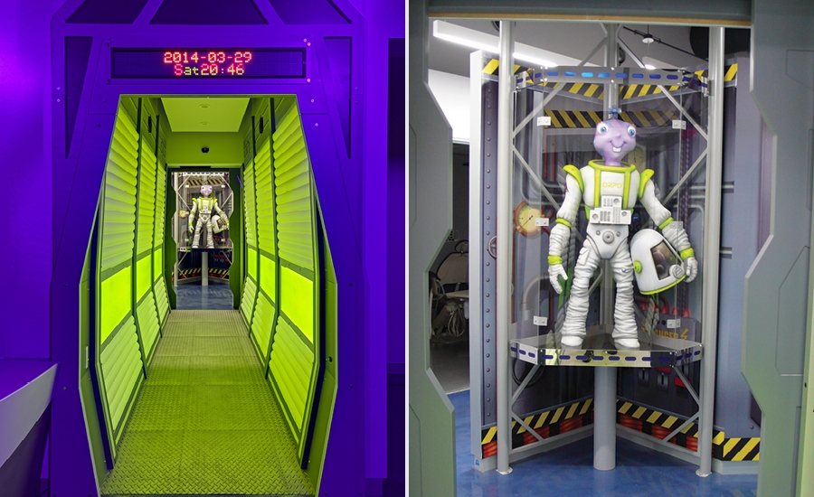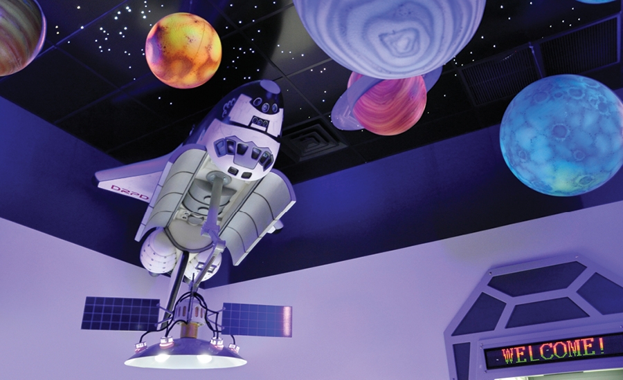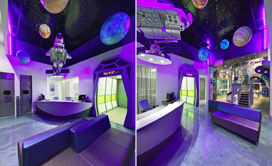 When patients are called to the treatment bay, they are led through a custom-designed hallway. Funky backlit acrylic panels featuring a honeycomb core light the way down the hall. Something as simple as an automatic door, clad to look like an airlock, can create a feeling of excitement and wonder in children as they go for treatment. Once the door opens, impressive glowing red rocket boosters loom above the treatment rooms.