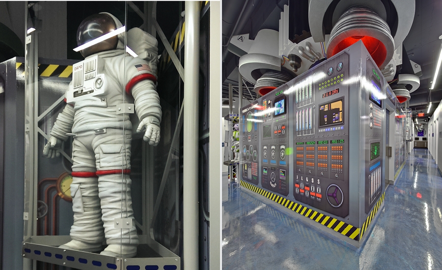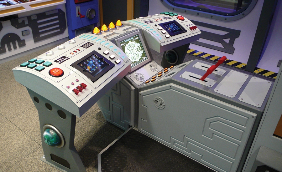 The amazing control panel, covered in buttons, switches, toggles and two gaming iPads, simulates a rocket launch. Interacting with the panel activates authentic voice commands from NASA indicating airlocks being engaged, the count down to launch, and the final blast off. A ground shaking subwoofer makes the blast off a truly immersive experience.