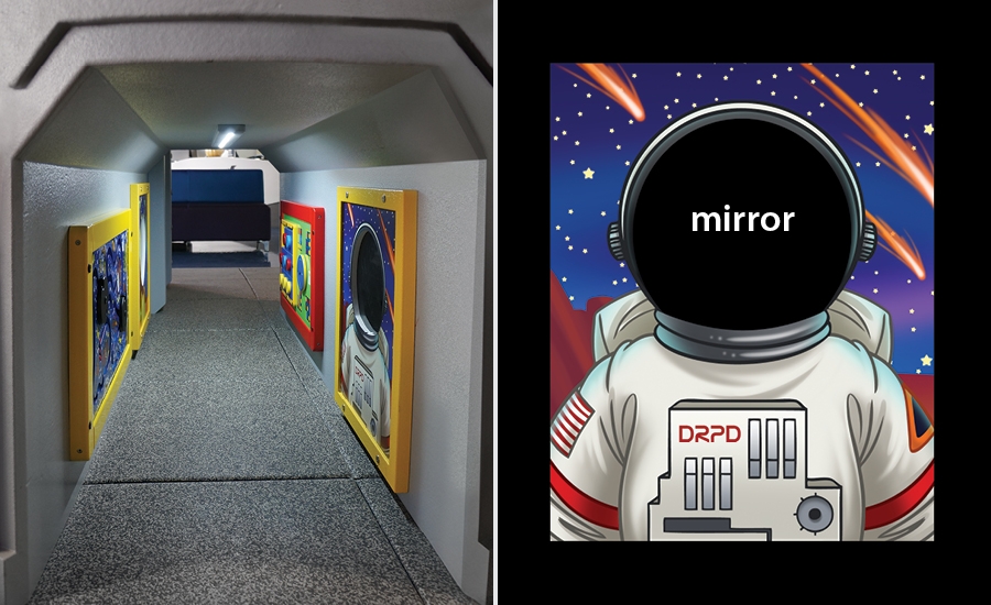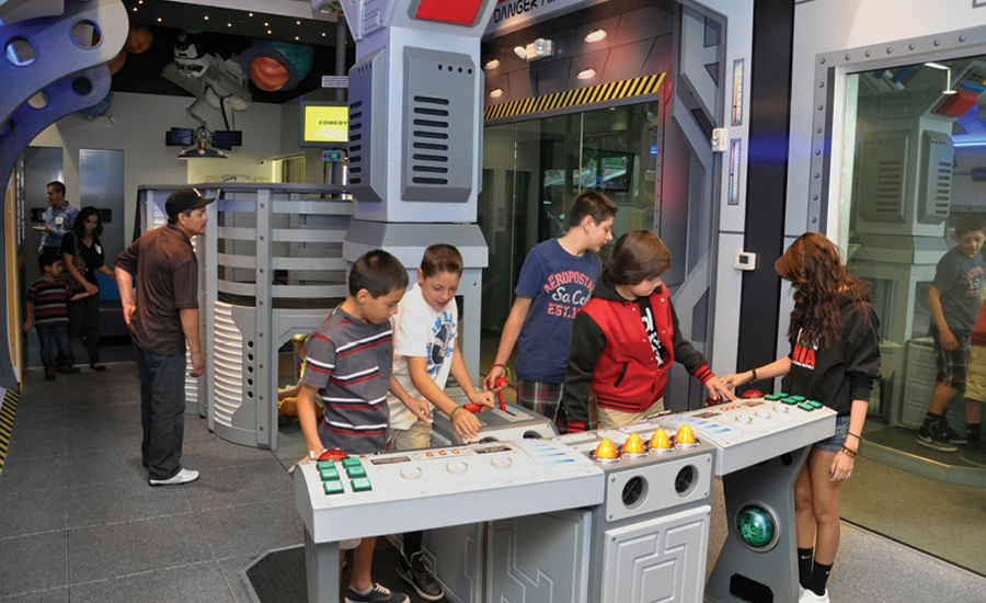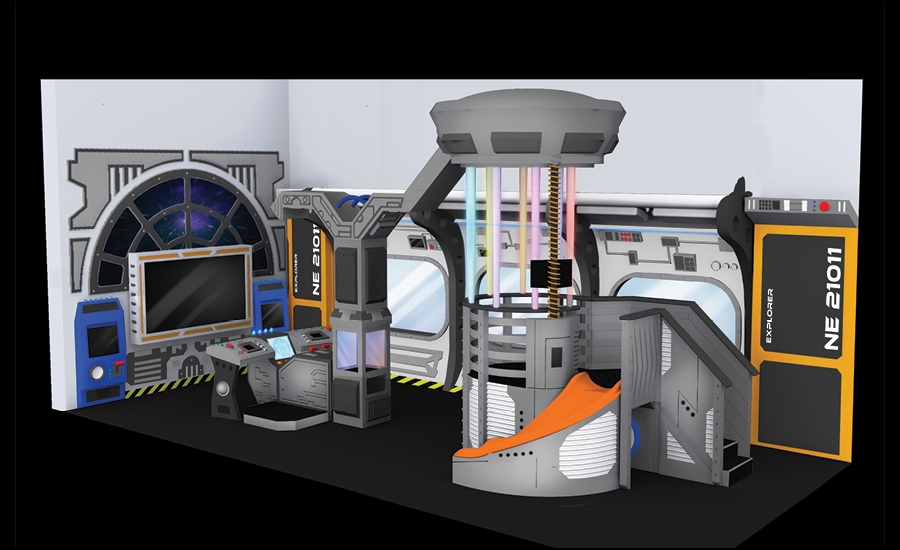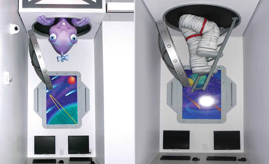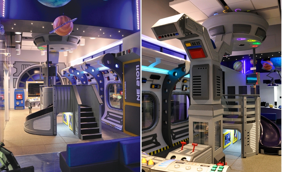 This games room is more likely to be found in a science center, featuring a unique spaceship design and special science-themed activities. An interactive light game creates a cool futuristic centerpiece as well as great entertainment for kids who must break the beams of colored light. Younger children can crawl below to find hands-on games and special mirrors featuring an astronaut and alien graphic.