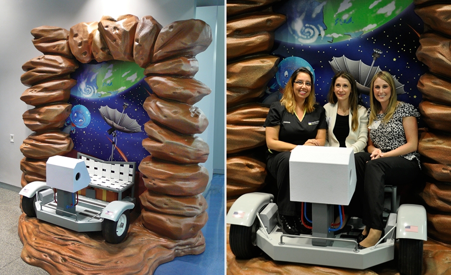 A Mars Rover photo op at the end of the treatment area is a perfect place for kids to show off their shiny, polished smiles. A touchscreen in the rover controls a camera mounted on the opposite wall making sure patients get the perfect photos every time.
