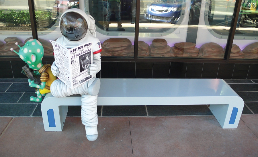 Showing off your office to people passing by is a great way to draw in new patients. The large windows present a full view of the spaceship play area inside. It also creates a great backdrop for the bench photo op. LED chase lights create a mesmerizing ambient glow, flashing from red to blue to green.