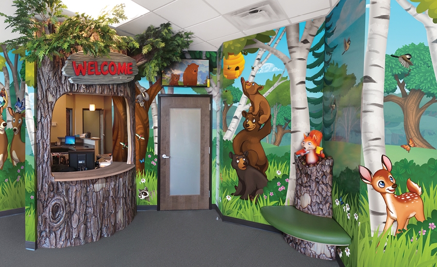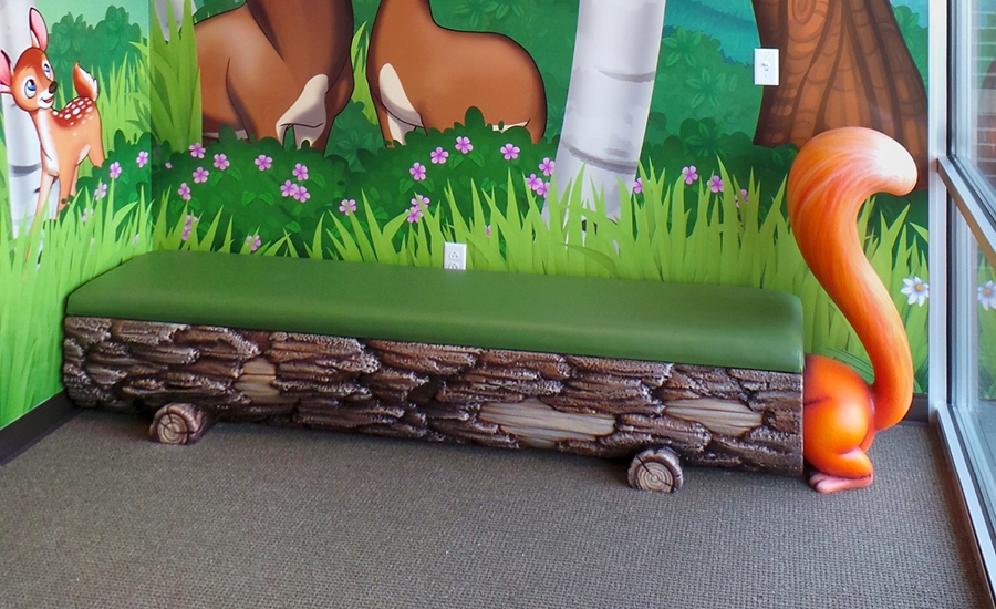 The murals, seating and desk have a huge impact on this small waiting room. The detailed bark and rich paint job create a cozy atmosphere for waiting patients.
