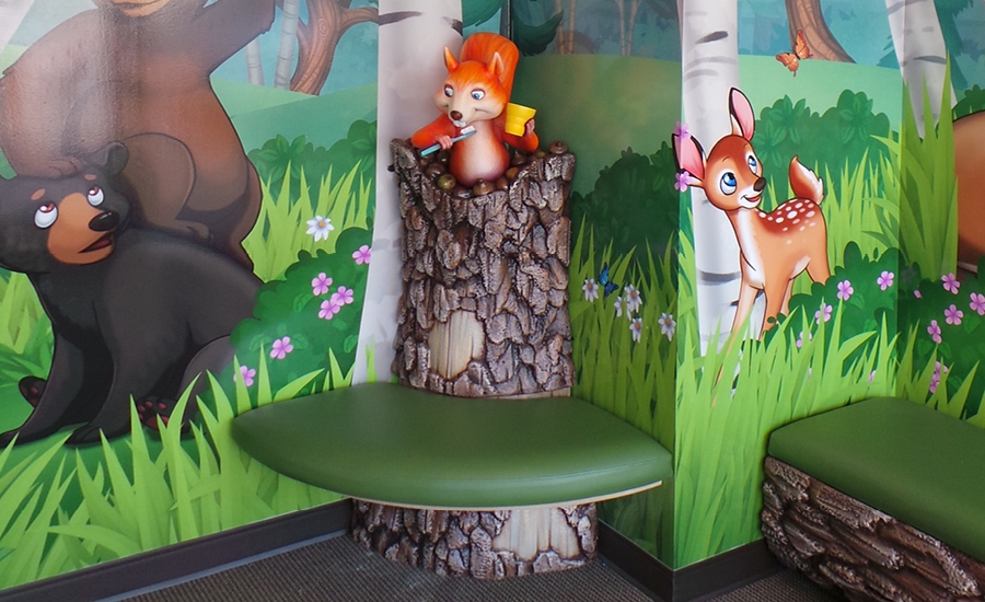 If you go down to the woods today you’ll get a big surprise – you’re not actually in the woods, you’re in a themed reception area full of trees and friendly forest critters! Using the office’s mascot, a bright orange squirrel, IDS created a forest theme where he is right at home.