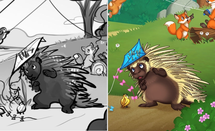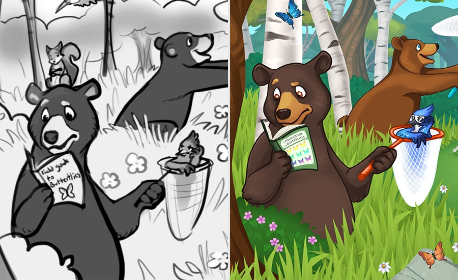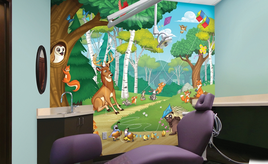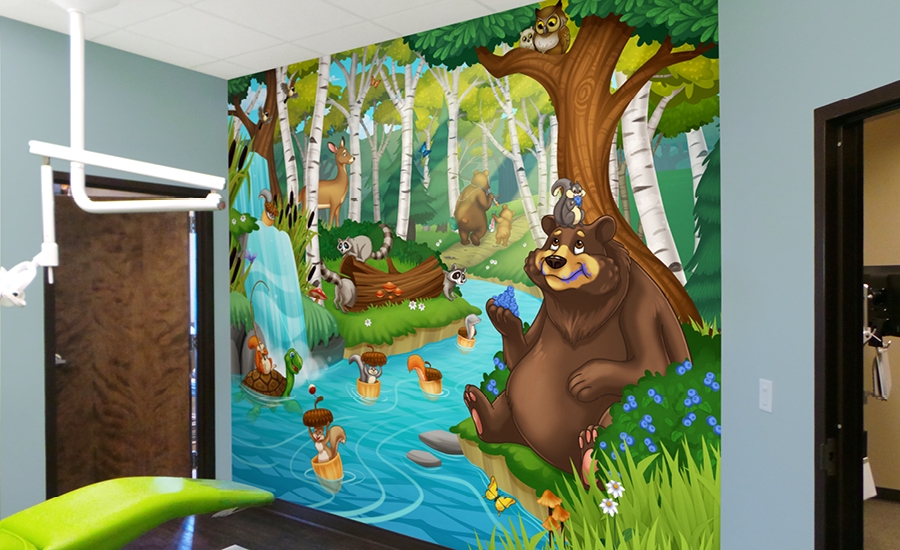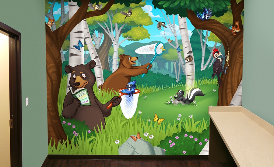 Each treatment room has a custom mural with a scene filled with forest creatures doing fun activities. The more you look, the more you’ll find. Patients will love coming to these treatment rooms for the chance to see creatures flying kites, a bear failing miserably at catching butterflies, or a very annoying woodpecker, among many other characters.