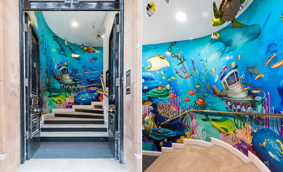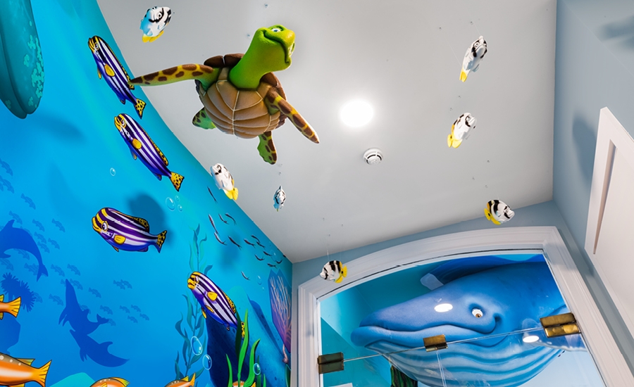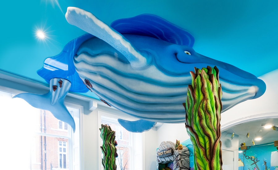 For their second office, an underwater theme was chosen. Patients enter through a street-level door that leads them up a set of stairs to the reception area. Right as visitors step through the glass doors they will be face to face with an amazing whale dipping down from the ceiling over the reception desk.