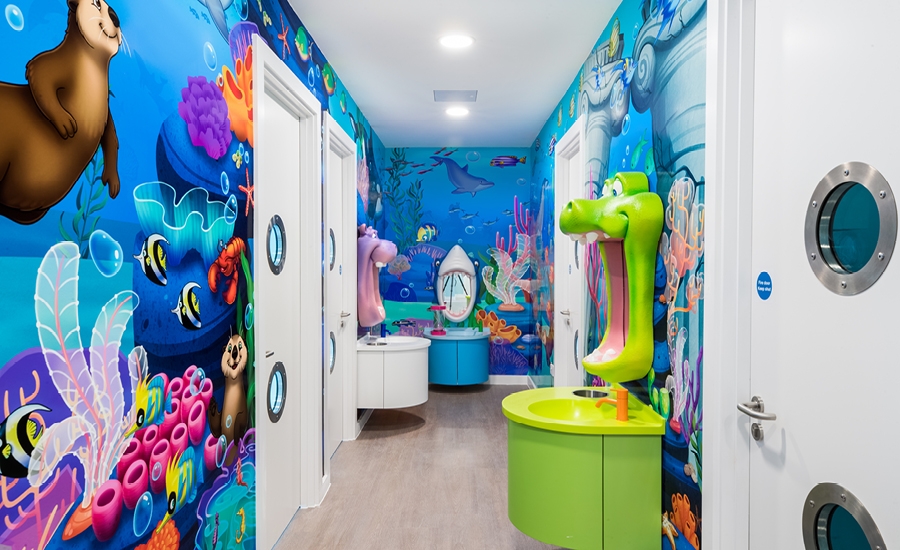 The brushing area has multiple stations, each with a different animal character mirror and full floor to ceiling murals to complement the 3D elements. No kid will resist brushing their teeth when they can do it in such a fun environment!