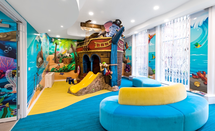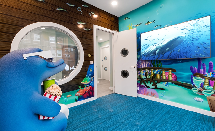 Down the hall kids will be delighted to find a beach play area with a pirate ship play structure and lots of colorful murals. The elephant ship captain, wall mounted game units, and whimsical details will hold the attention of young patients waiting for their appointments. The adorable monkey pirate even acts as a photo op where visitors can make a social media moment to share online.