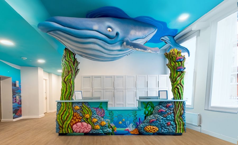 The desk itself features coral themed cladding on the front. Along with some custom underwater murals, the reception area has a themed prize tower to reward kids for successful appointments.
