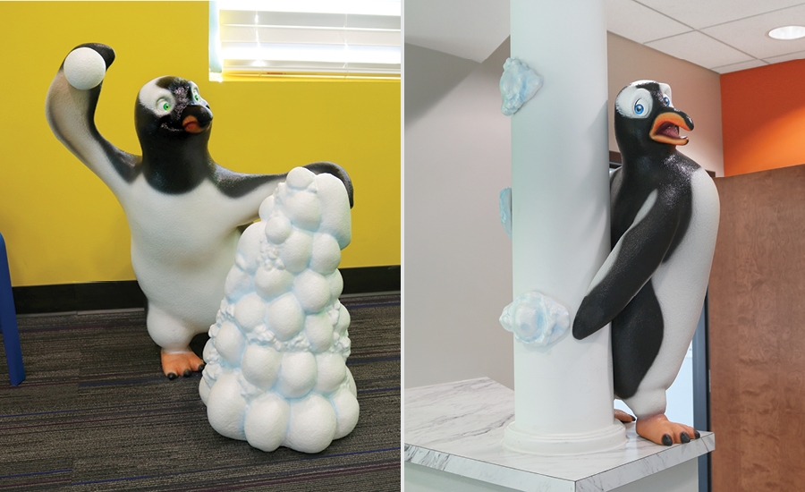 A custom sign with glowing LED lights is displayed against the back wall. The icy creation has sculpted penguins popping in and out of it making fun as well as functional.