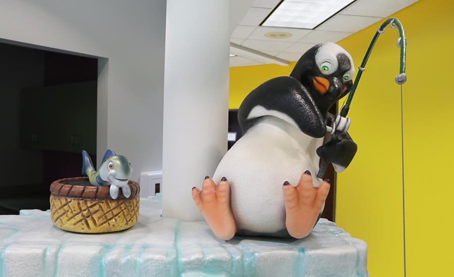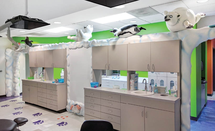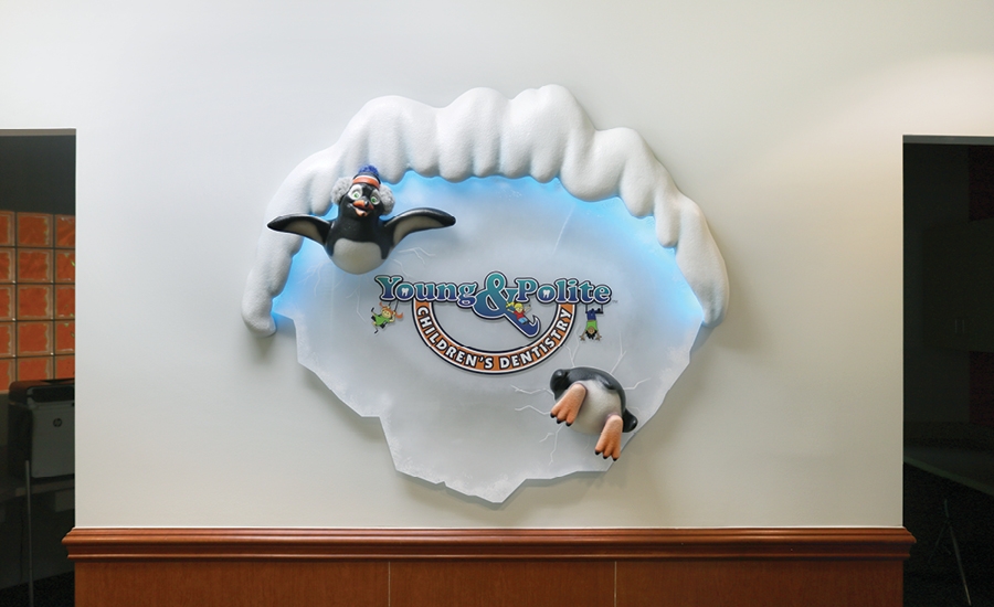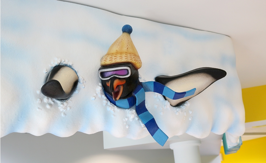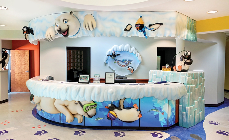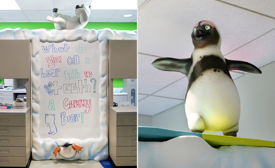 Visitors and patients at this pediatric dental office will immediately feel chilled out when they see the arctic reception desk. Featuring polar bears and penguins fishing, swimming, playing, and bursting out of the snow, there are a lot of characters to look at and enjoy.