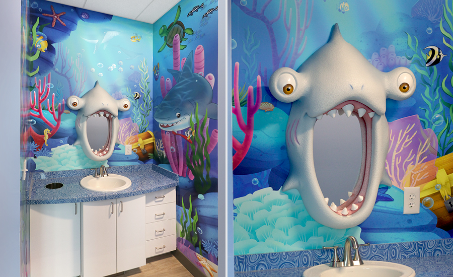 The fun doesn’t end at the water’s edge. Underwater murals bring the adventure to the treatment area where a hammerhead brushing mirror shows off his pearly-white teeth and helps kids get excited to keep their teeth white too!