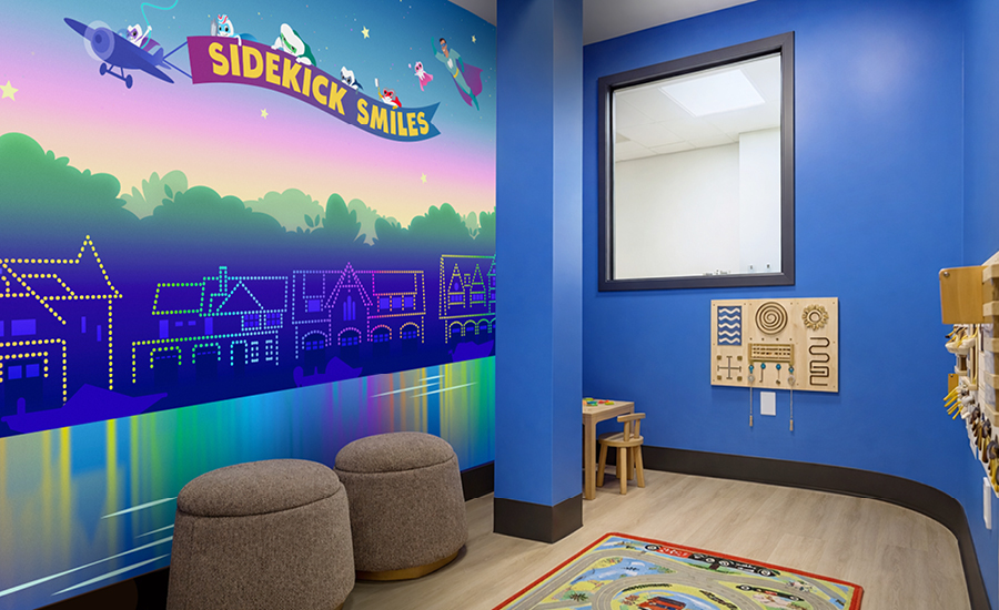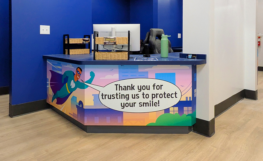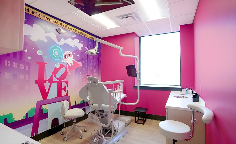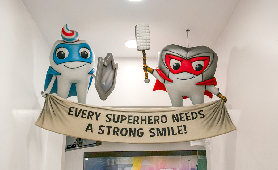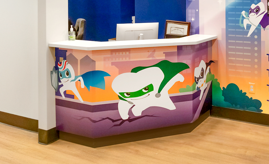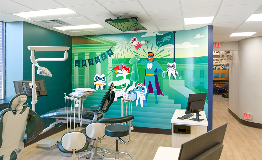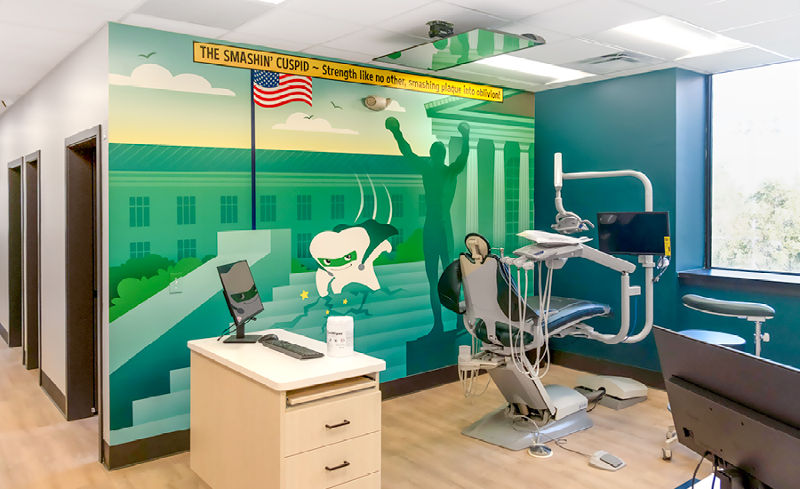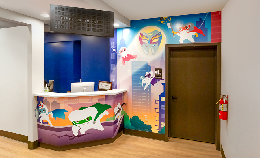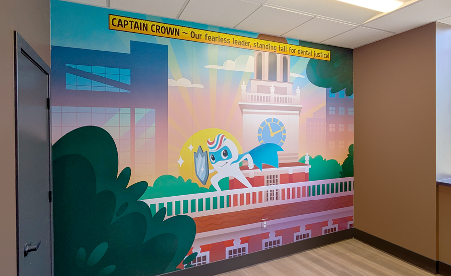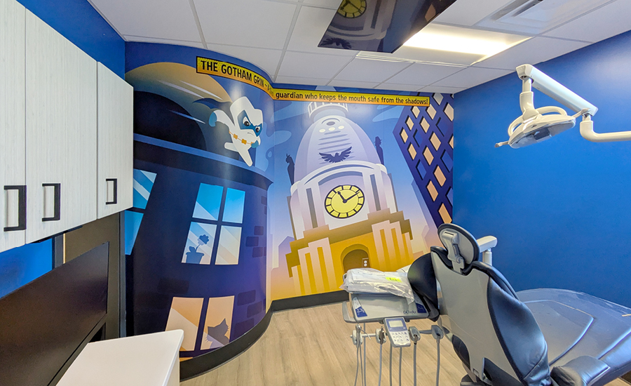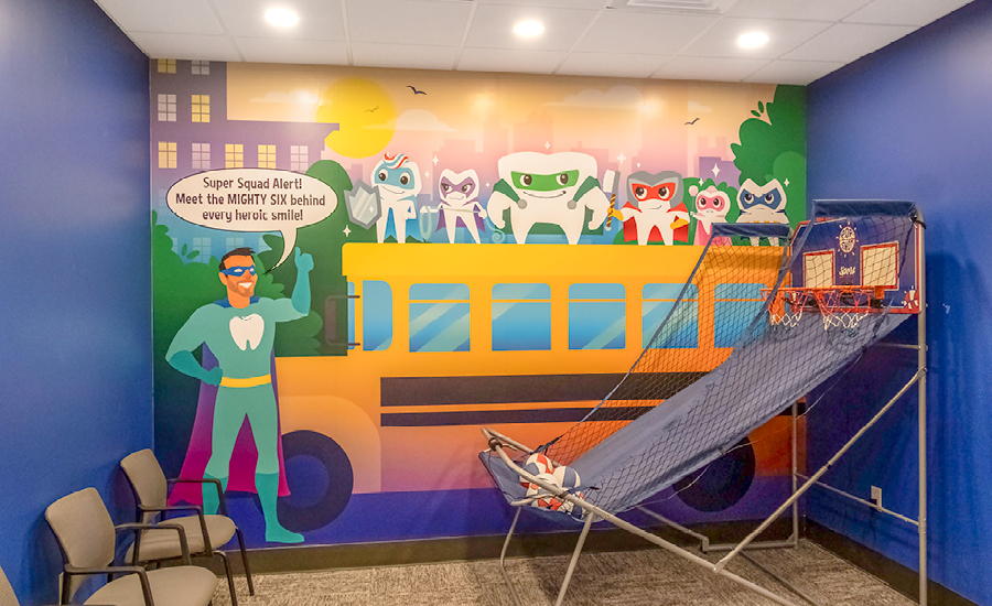 The storytelling continues past the waiting areas with murals in treatment rooms and in the open bay, featuring heroic scenes and character “spotlights” that help distract, entertain, and build positive associations with appointments.