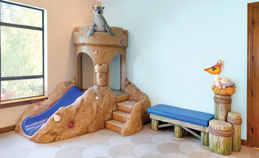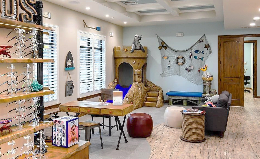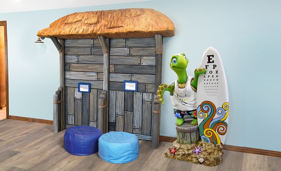 These two optometry clinics feature some amazing beach decor, such as exterior sculptures of fun characters greeting patients, themed photo opportunities that double as custom seating, plus a slippery slide for young patients and a tablet gaming area for older kids. Those surfboard eye chart photo ops are making quite a splash on social media.