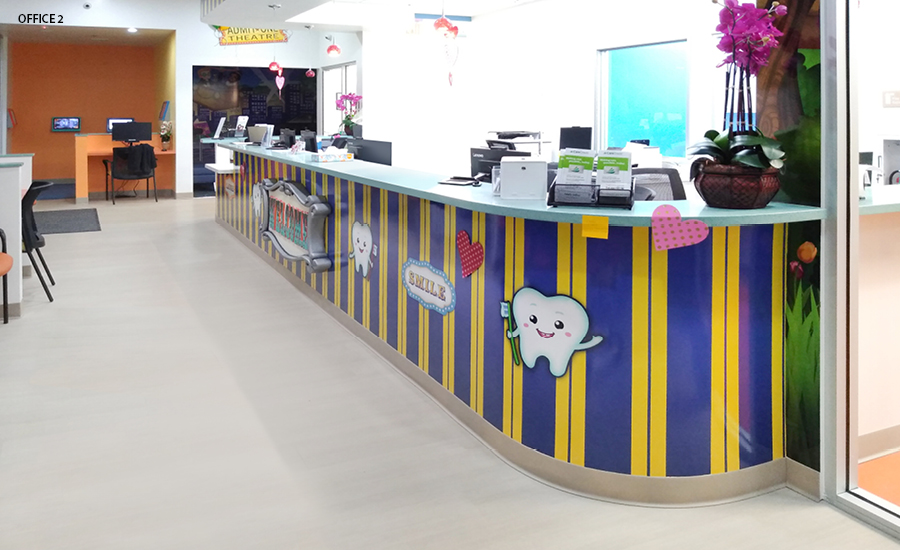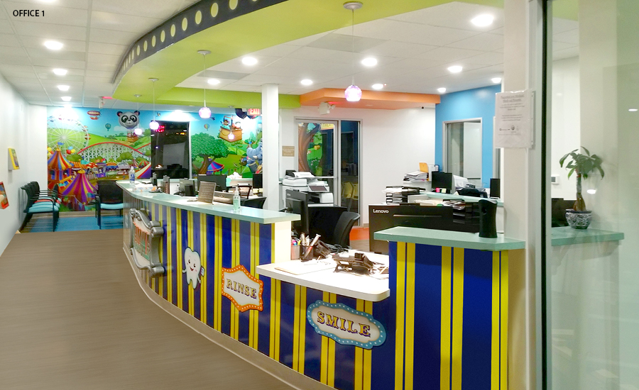 The reception desks all have a carnival stripe pattern on the front and a 3D welcome sign. In the waiting area, play area, or treatment bay there are detailed and colorful wall murals depicting a carnival scene that will keep patients entertained as they wait.