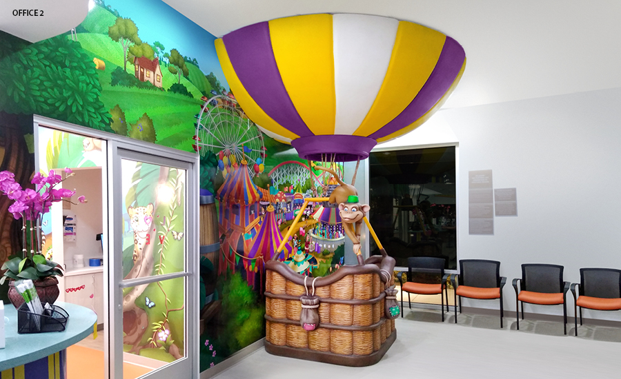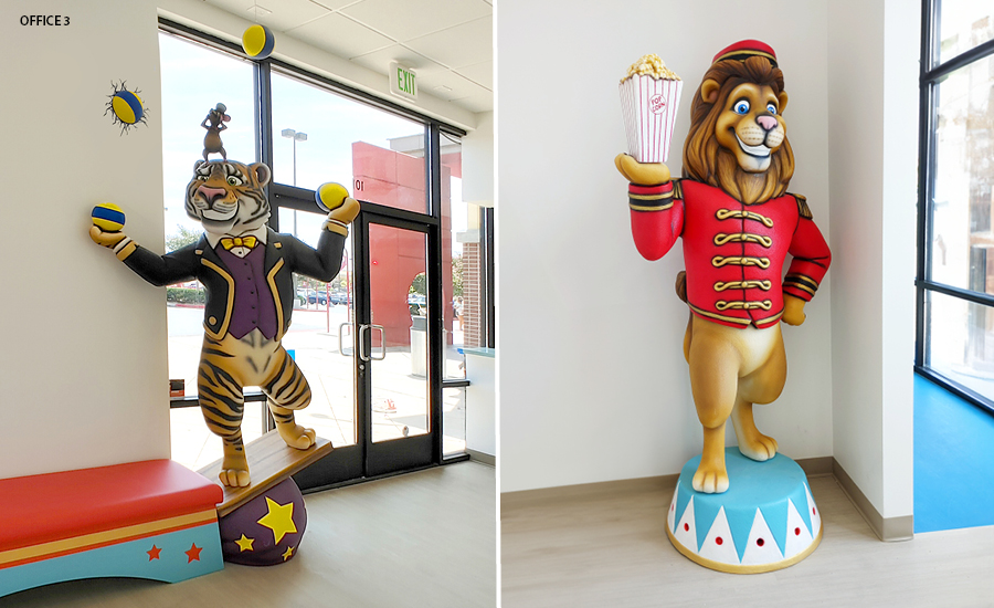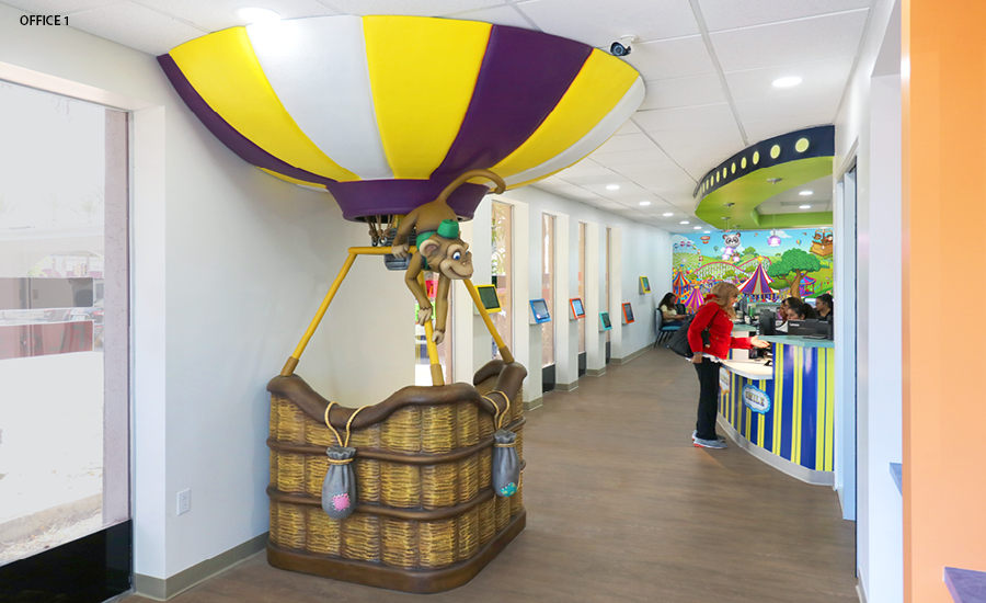 Step right up! Prepare to be dazzled by a dental experience that’s nothing short of a circus spectacle! As you arrive to the practice, there is always a character to welcome families. A ringmaster elephant, juggling tiger, or a popcorn-loving lion are featured at different locations. Some locations include a sculpted hot-air balloon photo op where kids can take pictures to share and say hi to the cute monkey character climbing on the outside.
