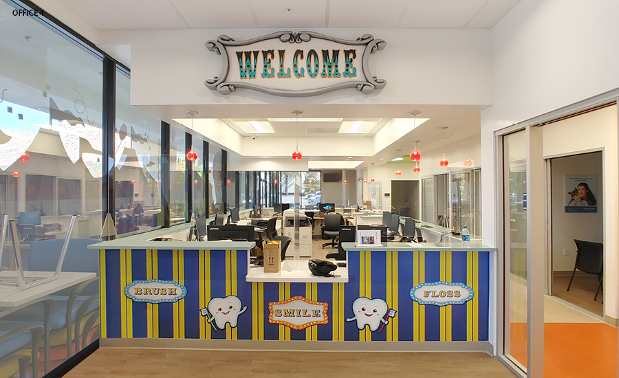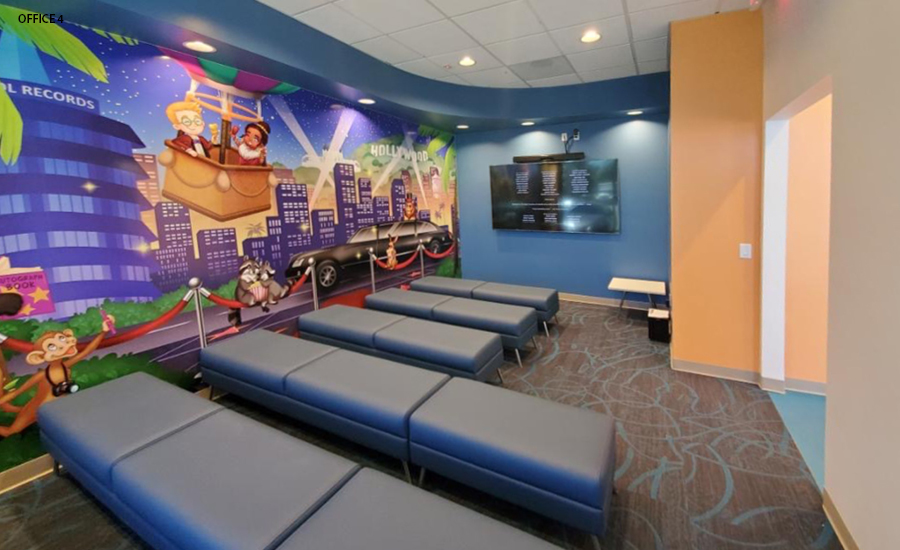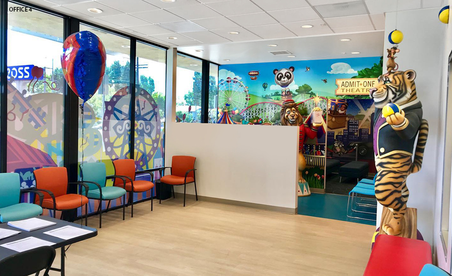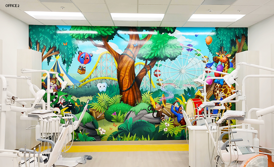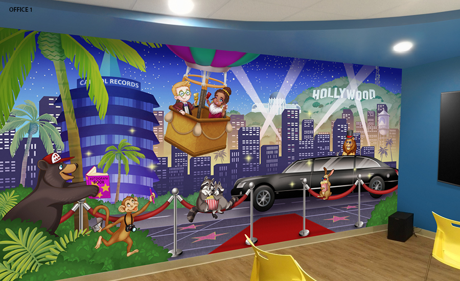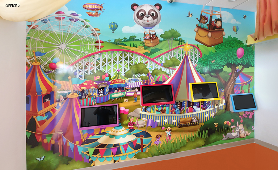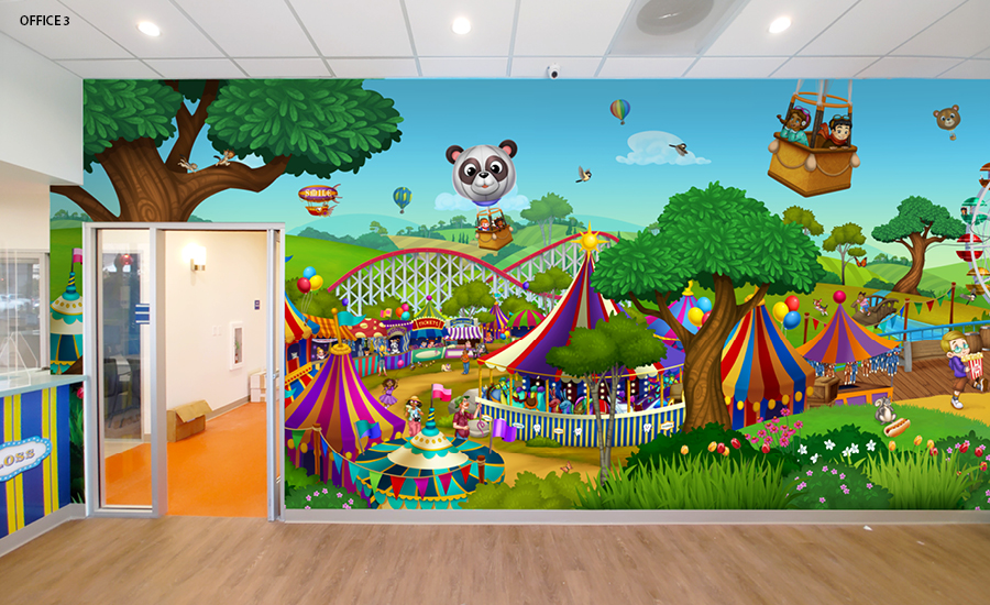 No, you’re not seeing double… or triple! For this DSO, we have installed a carnival theme at 10 of their locations. The repeated characters and murals are adapted to fit each office size, space, and layout.