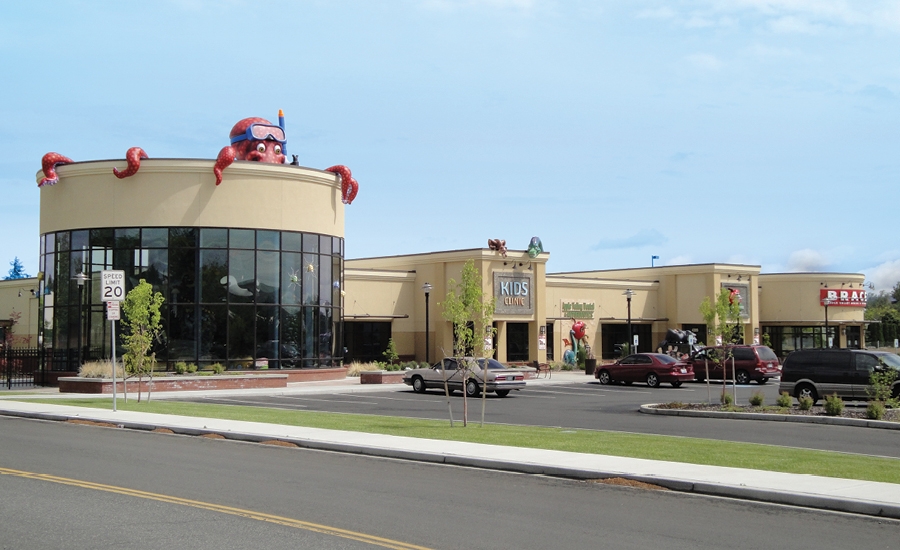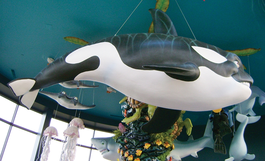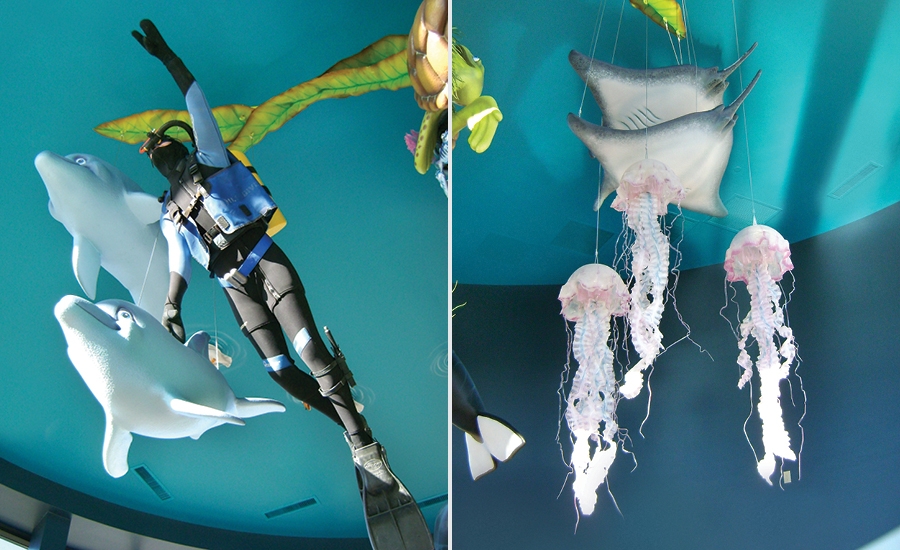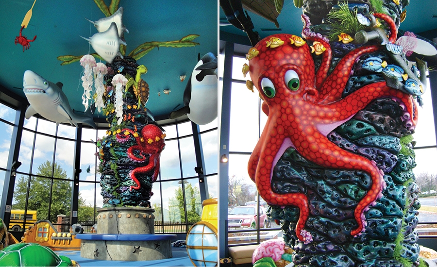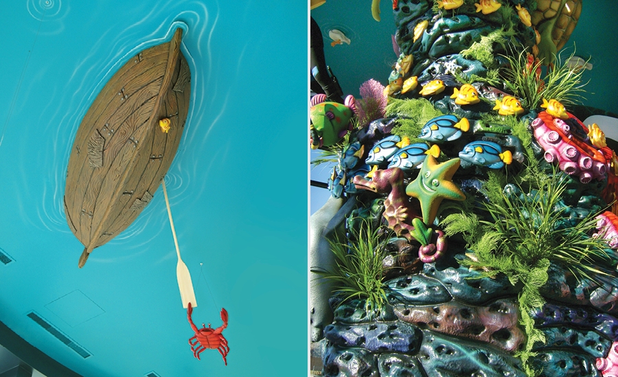 This dental office came to us with a desire to really WOW their patients! In the young children’s play area and waiting room, we campe up with the idea for an animated coral tower. Imagination Design Studios designed a stunning tower of coral that would use a motor to animate large ocean creatures so it looked like they were swimming in circles around the top!