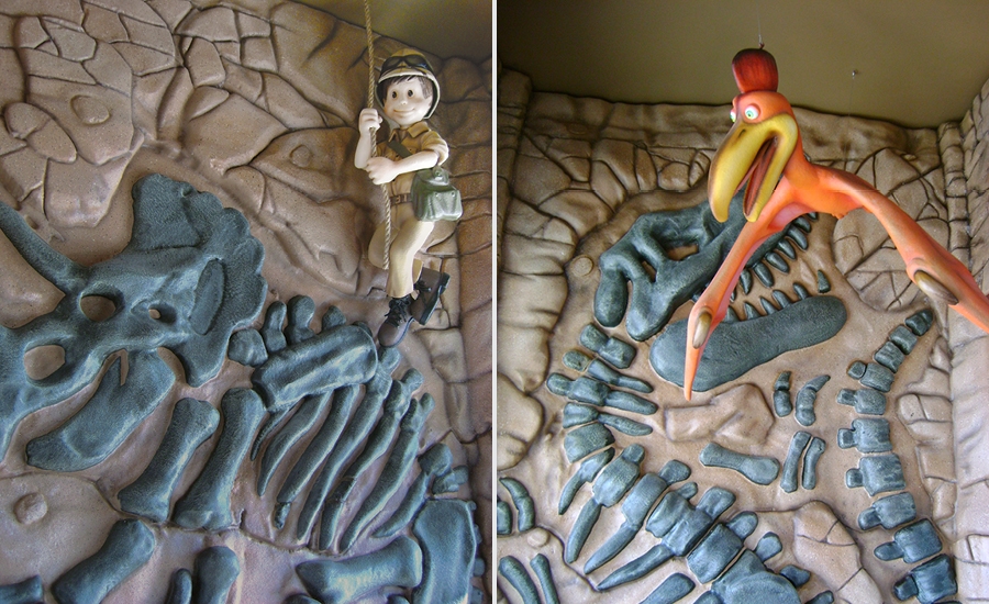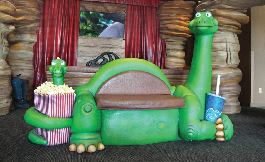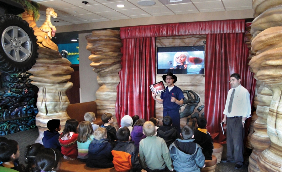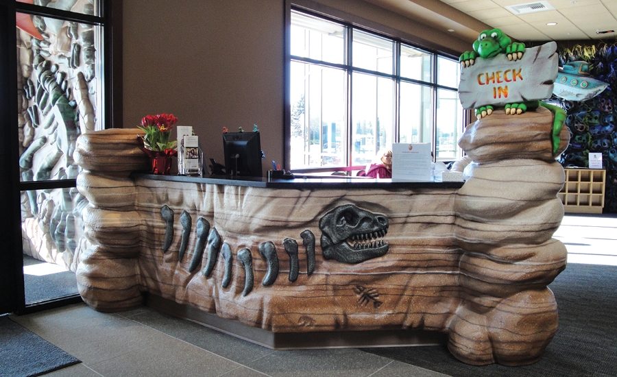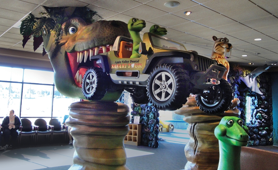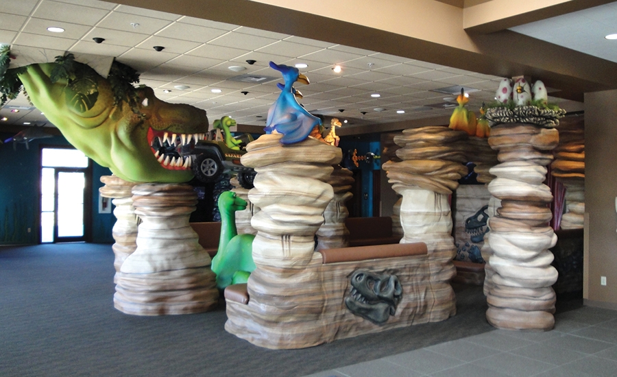 The coral tower isn’t the only feature that keeps visitors happy at this dental office; half of the office has been decorated with a dinosaur theme. A children’s theater was created with sculpted dinosaur characters that watch educational and entertaining videos alongside young patients.