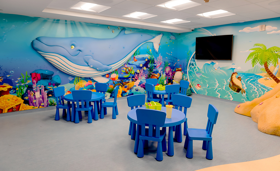 This vibrant beach-themed play area was custom-designed for a church to create an engaging and inviting environment for young children. The immersive ocean mural, complete with a friendly blue whale and colorful marine life, transforms the space into an undersea adventure.