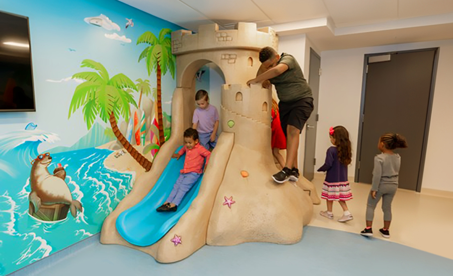 The centerpiece is a playful sandcastle with an integrated slide, encouraging active play and interaction among the children. The surrounding murals continue the seaside theme, featuring cheerful sea creatures, palm trees, and surfboards, transporting kids to a tropical beach paradise.