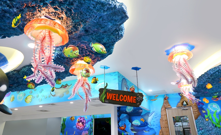 This is the third office project for a very special dental client. Continuing the theme of underwater office makeovers, this space is the most extensive yet. The impressive reception and waiting area is the first sight visitors will see as they enter the office and features full custom wall murals, a themed check-in desk, benches, a play area, and character sculptures suspended from the ceiling above.