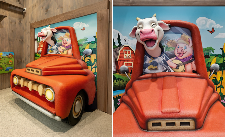 A bright red vintage farm truck takes center stage, complete with a singing cow and a banjo-strumming pig in the cab. Kids can climb aboard and imagine joyrides through farmland fields. -