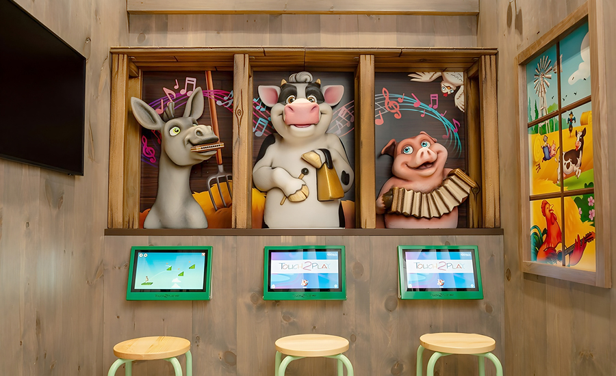 A grinning cat strums a banjo, a mother hen drums on her hatching eggs, and a trio of farm animals—donkey, cow, and pig—form a joyful band above three Touch2Play gaming stations offering kid-friendly digital entertainment. -