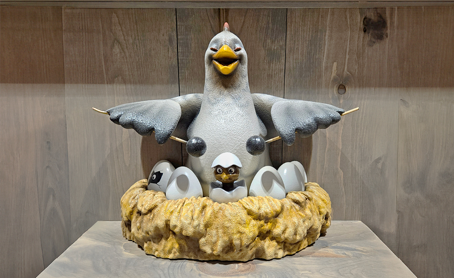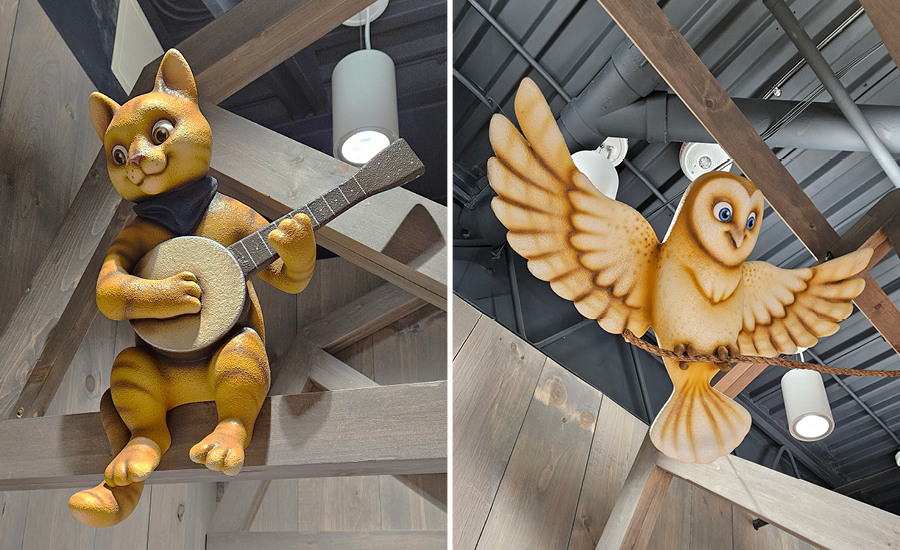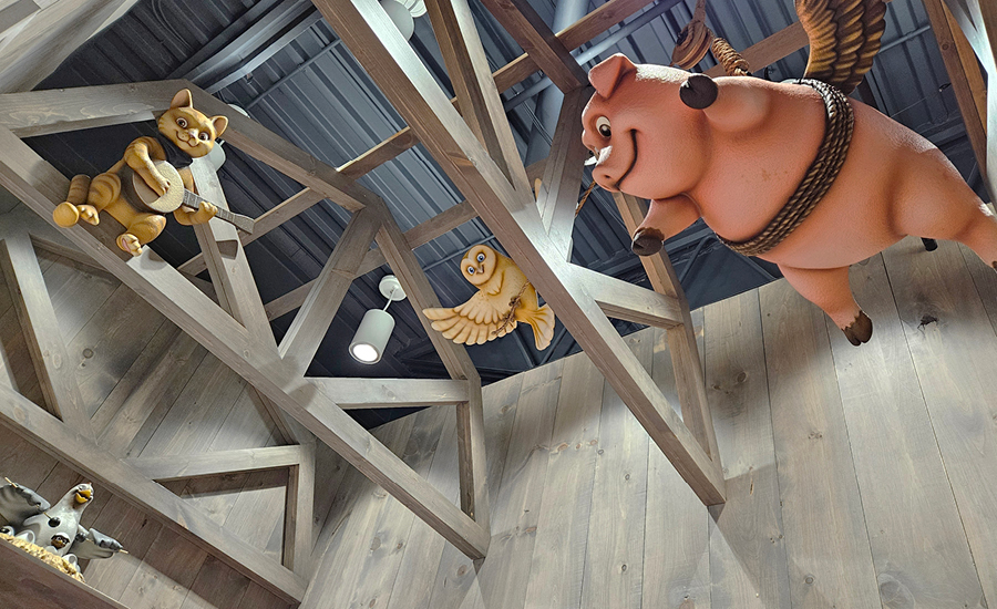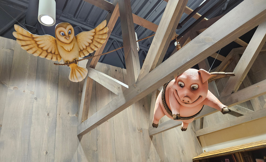 A winged pig takes flight alongside a wide-eyed owl, adding surprise and delight high above the play area.
