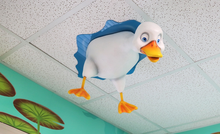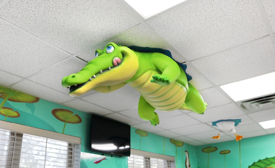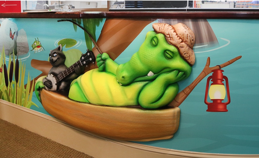 The marshland journey continues through the hallways with fact-filled murals, and into the open treatment bays. Here, a potentially intimidating space is transformed into an exciting underwater world beneath the bayou, filled with furry otters, lush underwater plant life and schools of fish. During their care, patients can turn their attention upward and spot an alligator swimming above as he searches for his next tasty meal.