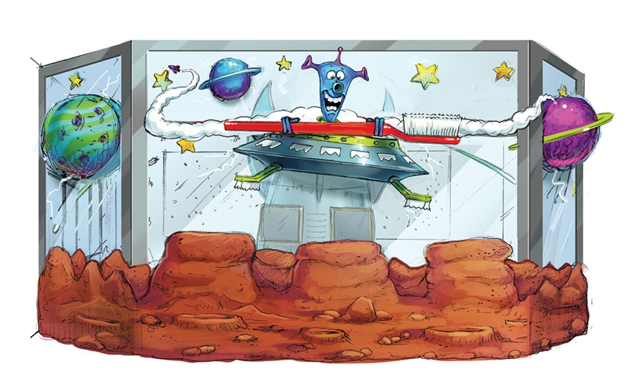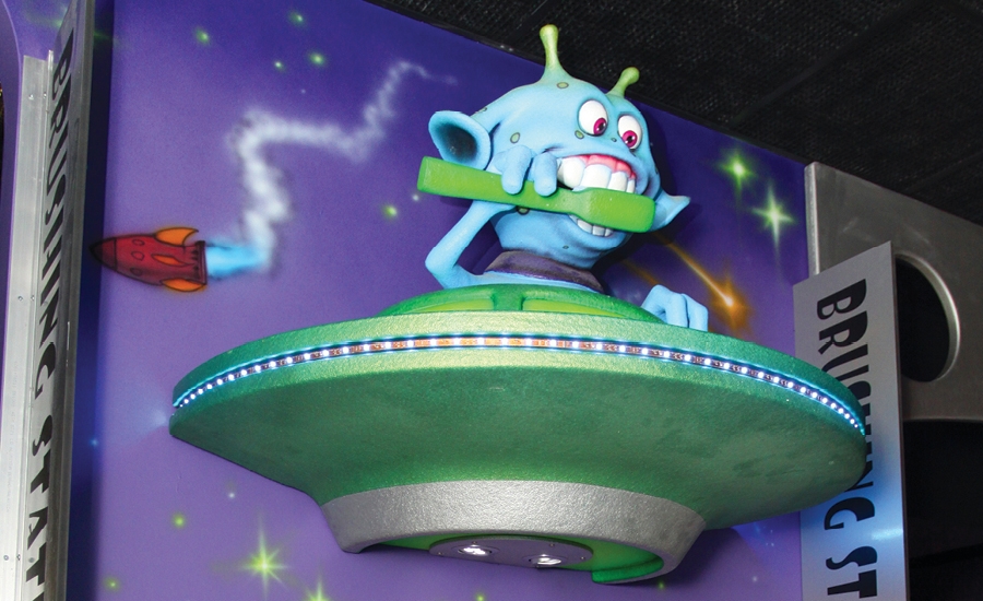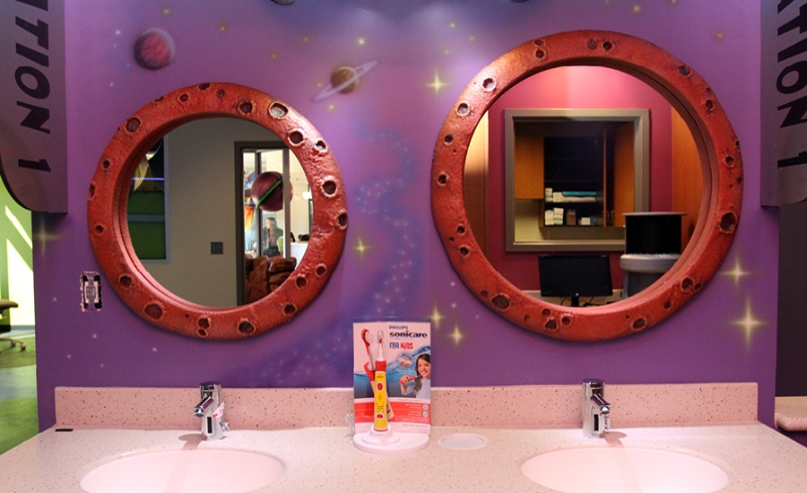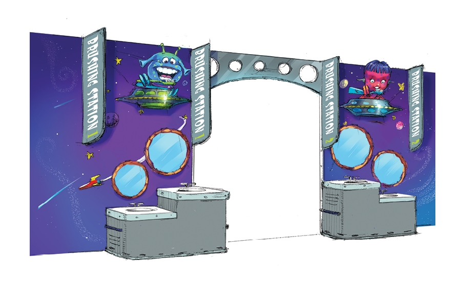 Each sink features an alien character in a spaceship above the mirrors. IDS even added color-changing LED lighting around the outside of each UFO. Kids are amazed and can’t wait for their turn to brush!